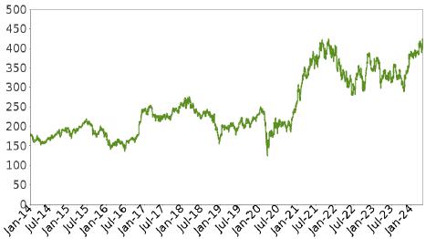 The following graph shows the daily historical performance of GS on its primary exchange in the period from January 1, 2014 through April 25, 2024. We obtained this historical data from Bloomberg L.P. We have not independently verified the accuracy or completeness of the information obtained from Bloomberg L.P. On the pricing date, the Closing Market Price of GS was $420.05. The graph below may have been adjusted to reflect certain corporate actions such as stock splits and reverse stock splits.