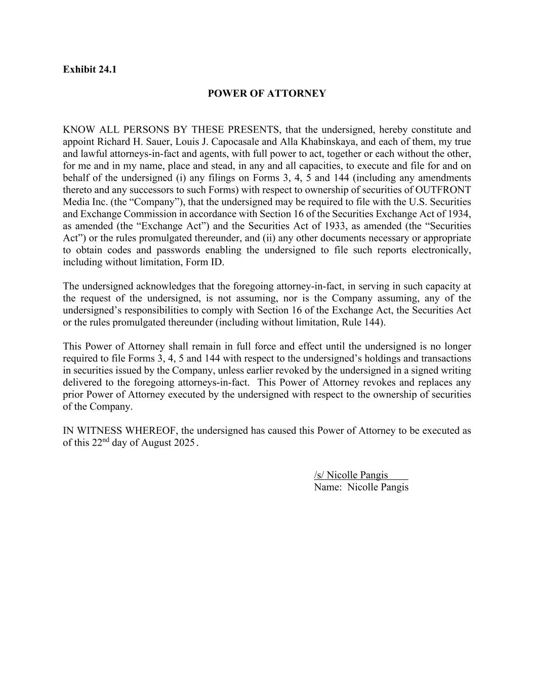 /s/ Louis Capocasale, Attorney-in-fact for Nicolle Pangis | 09/17/2025 | |