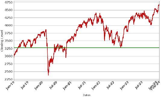 The graph below illustrates the performance of the SX5E from January 1, 2019 to February 7, 2024, based on the daily Closing Levels as reported by Bloomberg L.P. (“Bloomberg”), without independent verification. We have not conducted any independent review or due diligence of the publicly available information from Bloomberg. On February 7, 2024, the Closing Level of the SX5E was 4,678.85, which is its Initial Level. The green line indicates its Coupon Barrier and Downside Threshold of 3,275.20, which is equal to 70.00% of its Initial Level. The historical performance of the SX5E should not be taken as an indication of its future performance, and no assurances can be given as to the level of the SX5E at any time during the term of the Notes, including the Coupon Determination Dates. We cannot give you assurance that the performance of the SX5E will result in the return of any of your investment.