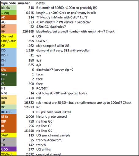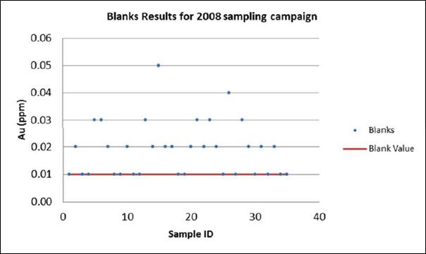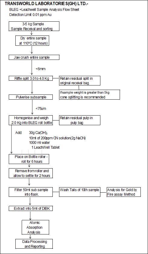 Sample assays were performed at either SGS Laboratories in Tarkwa, or Transworld (now Intertek) Laboratories, also based in Tarkwa. Analysis was carried out at Transworld until 2007 with analysis for gold by fire assay, analysis was then switched to SGS. Samples submitted to SGS were subjected to crushing and pulverisation with final analysis of a 50g sub-sample by fire assay with an AA finish.