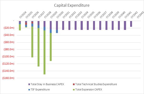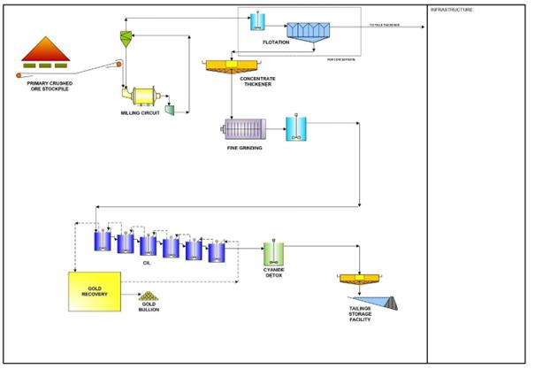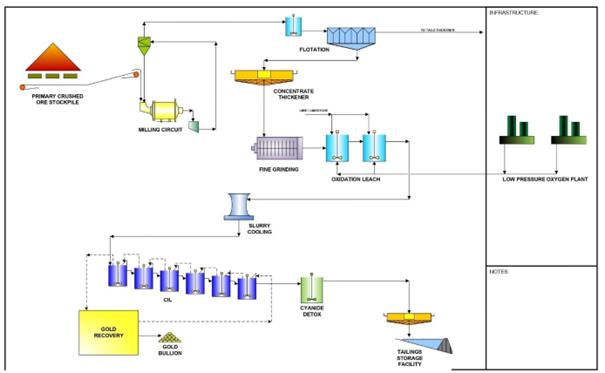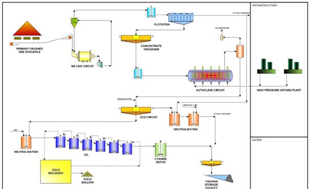 Scoping level capital and operating costs have been estimated for the refurbishment of the existing oxide CIL plant to process at the nominal design capacity of 1.5Mtpa. In addition, scoping level capital and operating costs have been assumed for a generic 4.5Mtpa new refractory gold plant to commence production in 2027.