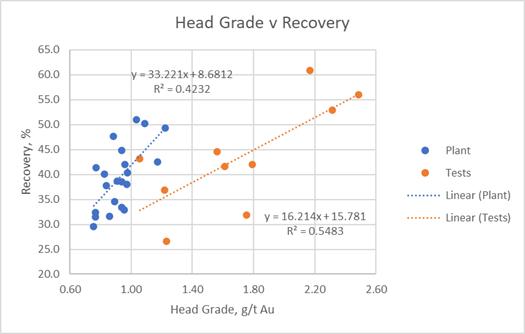 The recovery estimate used for the OP oxide resource (Stage 2) is circa 66% and is significantly lower than the recoveries achieved in the 2022/2023 production data presented by FGR. FGR state that, in fact, the oxide material will also contain some refractory sulphide, transition and moderately oxidised material, with refractory material likely to achieve recoveries of <50% and potentially significantly less. The proposed blend of oxide and sulphide/transition material is unknown, although overall classed as oxide in the LOM plan, and the actual blends produced will impact recovery compared to oxide alone.