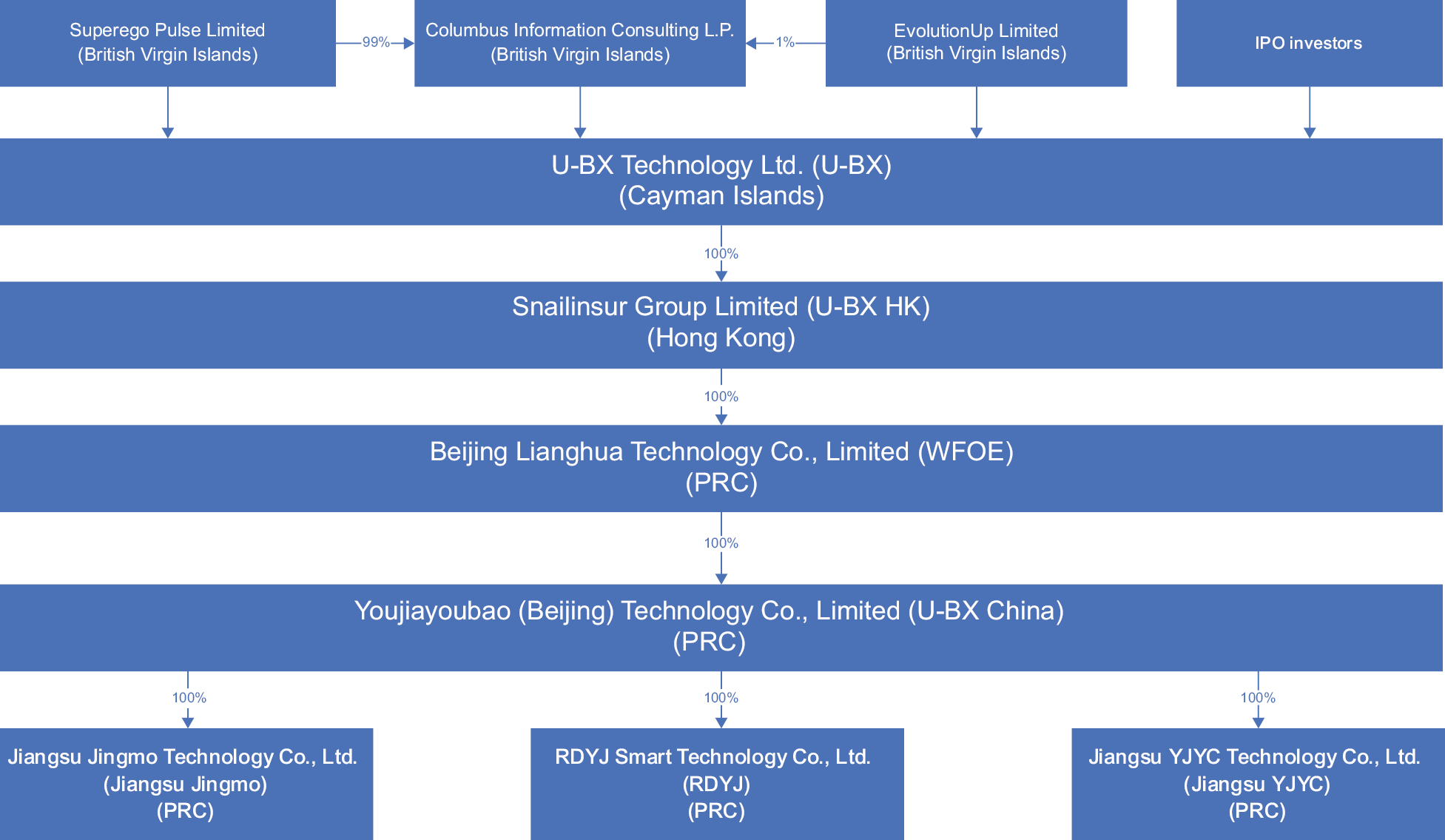 U-BX Technology Ltd., or U-BX, was incorporated in the Cayman Islands. As a holding company with no material operations of our own, we conduct our operations in China through Youjiayoubao (Beijing) Technology Limited, or U-BX China, and its subsidiaries based in China. U-BX is a holding company with no material operations of its own. We currently conduct our operations primarily through the PRC Operating Entities. Investors will not and may never directly hold equity interests in the PRC Operating Entities. After the dissolution of the VIE structure, U-BX now controls and receives the economic benefits of U-BX China and its subsidiaries’ business operation, if any, through equity ownership. Any references to “U-BX” are to U-BX Technology Ltd., the ultimate holding company and any references to “we”, “us”, “our Company,” “the Company,” or “our” are to U-BX Technology Ltd. (“U-BX”) and its subsidiaries. U-BX China and its subsidiaries, Jiangsu Jingmo Technology Co., Ltd., Jiangsu Youjiayouche Technology Co., Ltd. and Rudongyoujia Smart Technology Co., Ltd. conduct business operations, and there is no business or product division/concentration among all the subsidiaries.