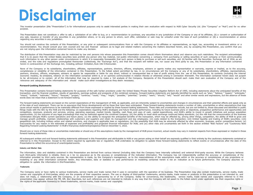 Disclaimer Page 2 This investor presentation (this “Presentation”) is for informational purposes only to assist interested parties in making their own evaluation with respect to HUB Cyber Security Ltd . (the “Company” or “Hub”) and for no other purpose . This Presentation does not constitute a offer to sell, a solicitation of an offer to buy, or a recommendation to purchase, any securities in any jurisdiction of the Company or any of its affiliates , (ii) a consent or authorization of any sale, issuance or transfer of any securities in any jurisdiction where, or to any person to whom, such offer, solicitation or sale may be unlawful under the laws of such jurisdiction or ( ii i ) a recommendation or advice regarding any securities in any jurisdiction . You should not construe the contents of this Presentation, or any prior or subsequent communications from or with the Company or i t s affiliates or representatives, as legal, tax, accounting or investment advice or a recommendation . You should consult your own counsel and tax and financial advisors as to legal and related matters concerning the matters described herein, and, by accepting this Presentation, you confirm that you are not relying upon the information contained herein to make any decision . The distribution of this Presentation may also be restricted by law and persons into whose possession this Presentation comes should inform themselves about and observe any such restrictions . The recipient acknowledges that it is ( i ) aware that the United States securities laws prohibit any person who has material, non - public information concerning a company from purchasing or selling securities of such company or from communicating such information to any other person under circumstances in which it is reasonably foreseeable that such person is likely to purchase or sell such securities, and (ii) familiar with the Securities Exchange Act of 1934 , as am ended, and the rules and regulations promulgated thereunder (collectively, the “Exchange Act”), and that the recipient will neither use, nor cause any third party to use, this Presentation or any information contained herein in contravention of the Exchange Act, including, without limitation, Rule 10 b - 5 thereunder . None of the Company or its subsidiaries, shareholders , affiliates, representatives, partners, directors, officers, employees, advisers or agents makes any representation or warranty, express or implied, as to the accuracy, completeness or reliability of the information contained in this Presentation . To the fullest extent permitted by law, in no circumstances will the Company or any of its subsidiaries, shareholders , affiliates, representatives, partners, directors, officers, employees, advisers or agents be responsible or liable for any direct, indirect or consequential loss or loss of profit arising from the use of this Presentation, its contents (including the internal economic models), its omissions, reliance on the information contained within it, or on opinions communicated in relation thereto or otherwise arising in connection therewith . The information contained herein does not purport to be all - inclusive or to contain all of the information that may be required to make a full analysis of the Company . Recipients of this Presentation should each make their own evaluation of the Company and of the relevance and adequacy of the information and should make such other investigations as they deem necessary . Forward - Looking Statements This Presentation contains forward - looking statements for purposes of the safe harbor provisions under the United States Private Securities Litigation Reform Act of 1995 , including statements about the anticipated benefits of the transaction, and the financial condition, results of operations, earnings outlook and prospects of the combined company . Forward - looking statements are typically identified by words such as "plan," "believe," "expect," "anticipate," "intend," "outlook," "estimate," "future," "forecast," "project," "continue," "could," "may," "might," "possible," "potential," "predict," "seem," "should," "will," "would" and other similar words and expressions, but the absence of these words does not mean that a statement is not forward - looking . The forward - looking statements are based on the current expectations of the management of HUB, as applicable, and are inherently subject to uncertainties and changes in circumstances and their potential effects and speak only as of the date of such statement . There can be no assurance that future developments will be those that have been anticipated . These forward - looking statements involve a number of risks, uncertainties or other assumptions that may cause actual results or performance to be materially different from those expressed or implied by these forward - looking statements . These risks and uncertainties include, but are not limited to, those discussed and identified in public filings made with the SEC by the HUB and the following : ( i ) expectations regarding HUB's strategies and future financial performance, including its future business plans or objectives, prospective performance and opportunities and competitors, revenues, products and services, pricing, operating expenses, market trends, liquidity, cash flows and uses of cash, capital expenditures, and HUB's ability to invest in growth initiatives and pursue acquisition opportunities ; (ii) the outcome of any legal proceedings that may be instituted against the combined company ; (iii) the ability to meet stock exchange continued listing standards ; (iv) the risk that the consummation of the business combination disrupts HUB's current operations and future plans ; (v) the ability to recognize the anticipated benefits of the transaction, which may be affected by, among other things, competition, the ability of HUB to grow and manage growth profitably, maintain relationships with custo