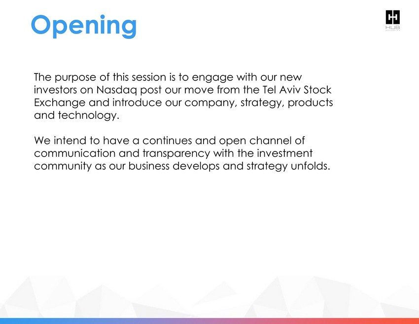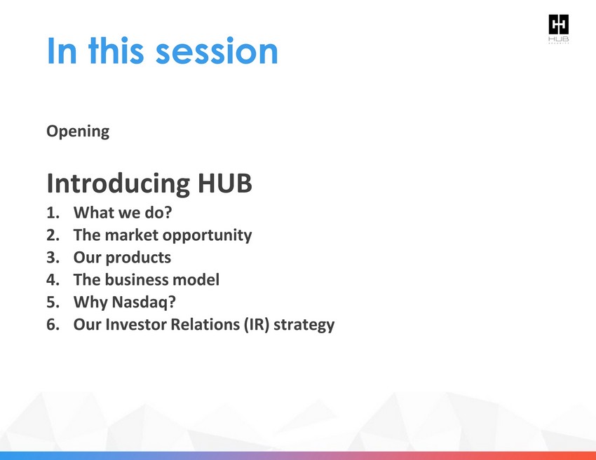 In this session Opening Introducing HUB 1. What we do? 2. The market opportunity 3. Our products 4. The business model 5. Why Nasdaq? 6. Our Investor Relations (IR) strategy
