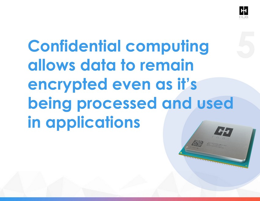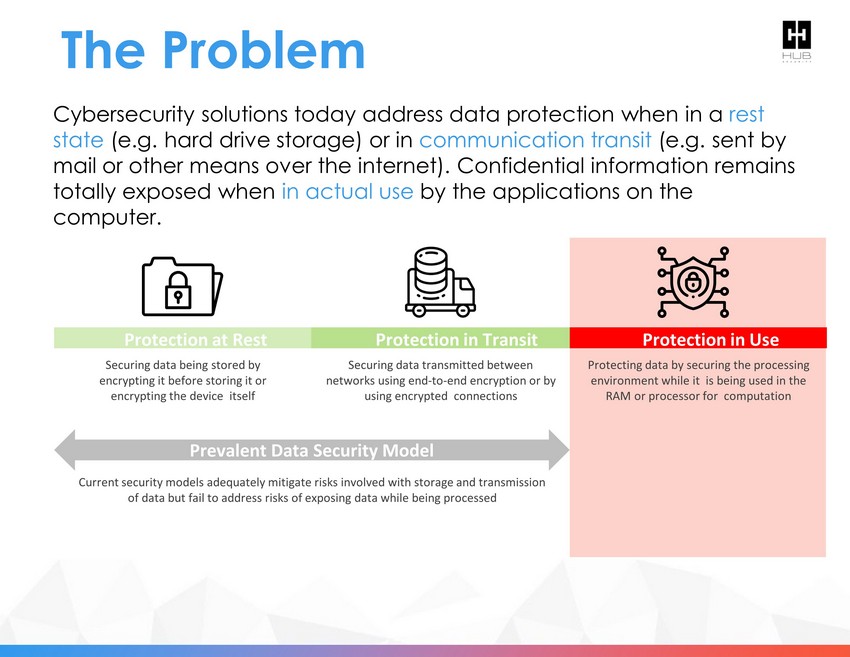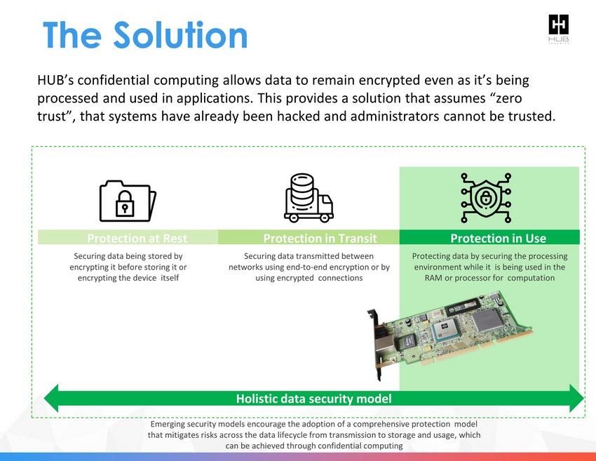 The Solution Protection in Transit Protection at Rest Protection in Use Securing data being stored by encrypting it before storing it or encrypting the device itself Securing data transmitted between networks using end - to - end encryption or by using encrypted connections Protecting data by securing the processing environment while it is being used in the RAM or processor for computation HUB’s confidential computing allows data to remain encrypted even as it’s being processed and used in applications. This provides a solution that assumes “zero trust”, that systems have already been hacked and administrators cannot be trusted. Holistic data security model Emerging security models encourage the adoption of a comprehensive protection model that mitigates ris k s across the data lifecycle from transmission to storage and usage, which can be achieved through confidential computing