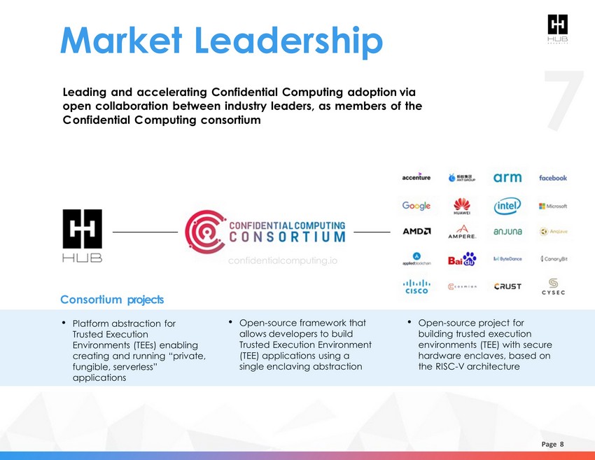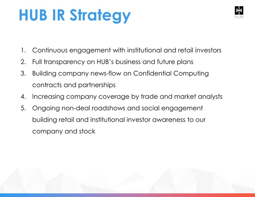 HUB IR Strategy 1. Continuous engagement with institutional and retail investors 2. Full transparency on HUB’s business and future plans 3. Building company news - flow on Confidential Computing contracts and partnerships 4. Increasing company coverage by trade and market analysts 5. Ongoing non - deal roadshows and social engagement building retail and institutional investor awareness to our company and stock