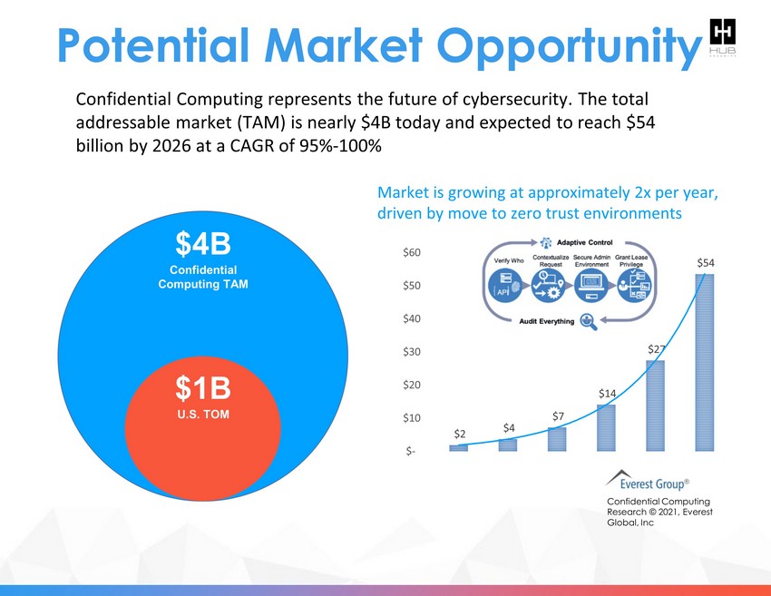 Confidential Computing represents the future of cybersecurity. The total addressable market (TAM) is nearly $4B today and expected to reach $54 billion by 2026 at a CAGR of 95% - 100% Confidential Computing Research © 2021, Everest Global, Inc $ 2 $ 4 $7 $14 $27 $54 $- $10 $20 $30 $40 $50 $60 $4B Confidential Computing TAM $1B U.S. TOM Market is growing at approximately 2 x per year, driven by move to zero trust environments Potential Market Opportunity