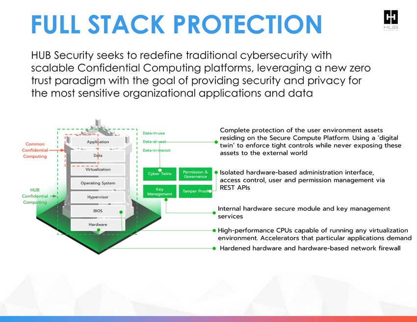 FULL STACK PROTECTION Complete protection of the user environment assets residing on the Secure Compute Platform. Using a ‘digital twin’ to enforce tight controls while never exposing these assets to the external world Hardened hardware and hardware - based network firewall Isolated hardware - based administration interface, access control, user and permission management via REST APIs Internal hardware secure module and key management services High - performance CPUs capable of running any virtualization environment. Accelerators that particular applications demand HUB Security seeks to redefine traditional cybersecurity with scalable Confidential C omputing platforms, leveraging a new zero trust paradigm with the goal of providing security and privacy for the most sensitive organizational applications and data