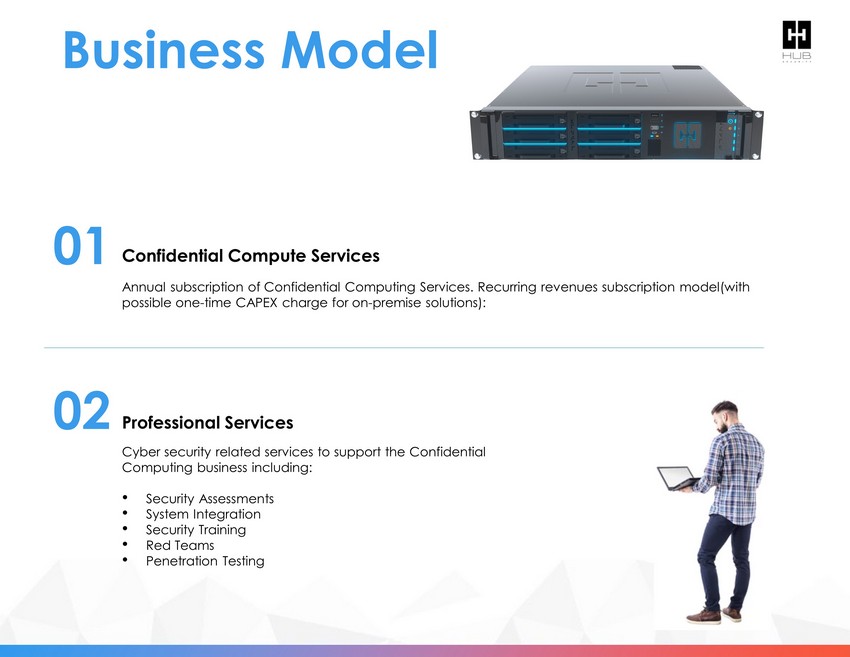 Confidential Compute Services Professional Services Annual subscription of Confidential Computing Services. Recurring revenues subscription model(with possible one - time CAPEX charge for on - premise solutions): Cyber security related services to support the Confidential Computing business including: • Security Assessments • System Integration • Security Training • Red Teams • Penetration Testing 01 02 Business Model