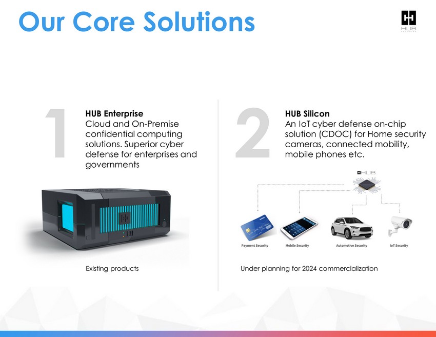 Our Core Solutions 2 1 HUB Enterprise Cloud and On - Premise confidential computing solutions. Superior cyber defense for enterprises and governments HUB Silicon An IoT cyber defense on - chip solution (CDOC) for Home security cameras, connected mobility, mobile phones etc. Existing products Under planning for 2024 commercialization