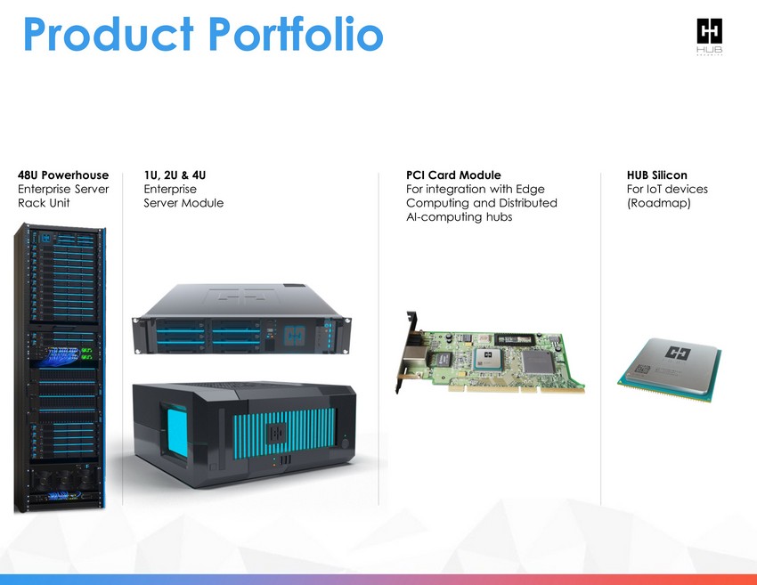 Product Portfolio 48 U Powerhouse Enterprise Server Rack Unit 1 U, 2 U & 4 U Enterprise Server Module PCI Card Module For integration with Edge Computing and Distributed AI - computing hubs HUB Silicon For IoT devices (Roadmap)