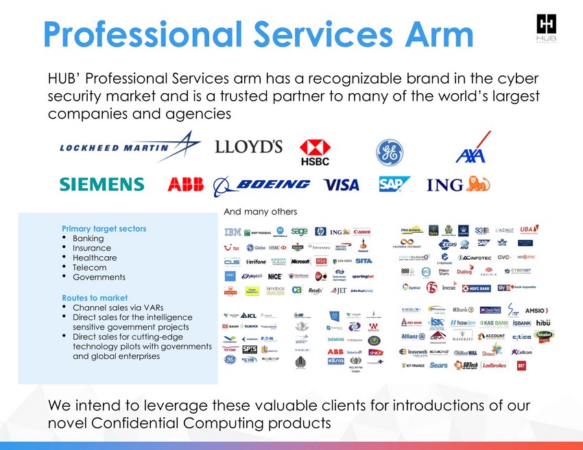 And many others Routes to market • Channel sales via VARs • Direct sales for the intelligence sensitive government projects • Direct sales for cutting - edge technology pilots with governments and global enterprises Primary target sectors • Banking • Insurance • Healthcare • Telecom • Governments HUB ’ Professional Services arm has a recognizable brand in the cyber security market and is a trusted partner to many of the world ’ s largest companies and agencies Professional Services Arm We intend to leverage these valuable clients for introductions of our novel Confidential Computing products
