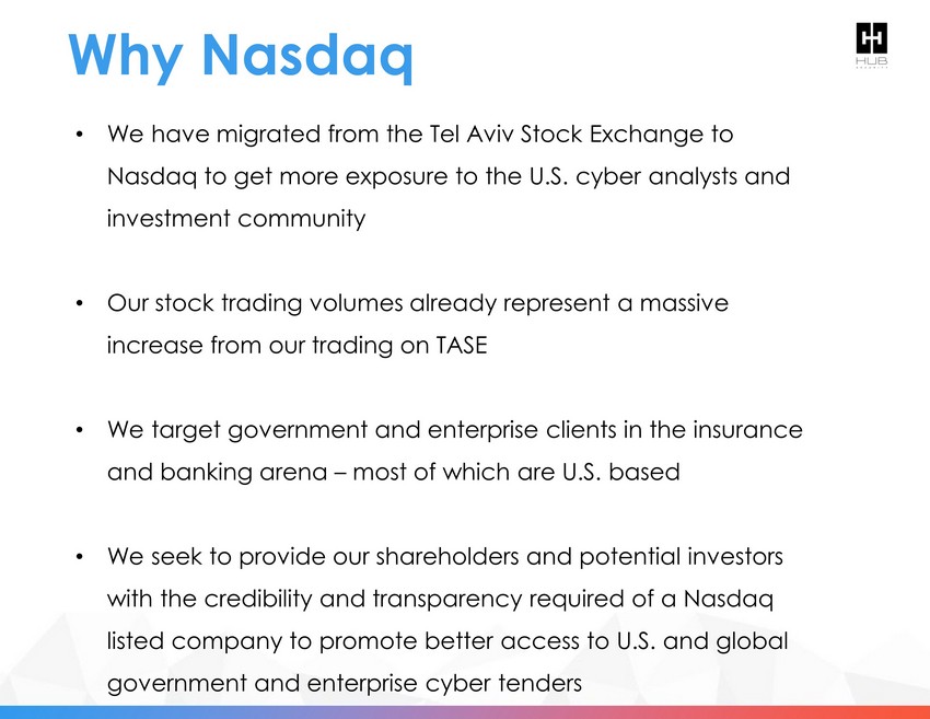 Why Nasdaq • We have migrated from the Tel Aviv Stock Exchange to Nasdaq to get more exposure to the U.S. cyber analysts and investment community • Our stock trading volumes already represent a massive increase from our trading on TASE • We target government and enterprise clients in the insurance and banking arena – most of which are U.S. based • We seek to provide our shareholders and potential investors with the credibility and transparency required of a Nasdaq listed company to promote better access to U.S. and global government and enterprise cyber tenders
