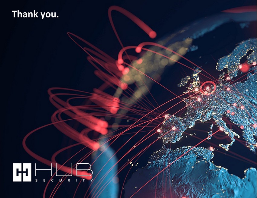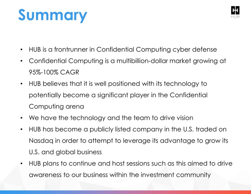 Summary • HUB is a frontrunner in Confidential Computing cyber defense • Confidential Computing is a multibillion - dollar market growing at 95 % - 100 % CAGR • HUB believes that it is well positioned with its technology to potentially become a significant player in the Confidential Computing arena • We have the technology and the team to drive vision • HUB has become a publicly listed company in the U.S. traded on Nasdaq in order to attempt to leverage its advantage to grow its U.S. and global business • HUB plans to continue and host sessions such as this aimed to drive awareness to our business within the investment community