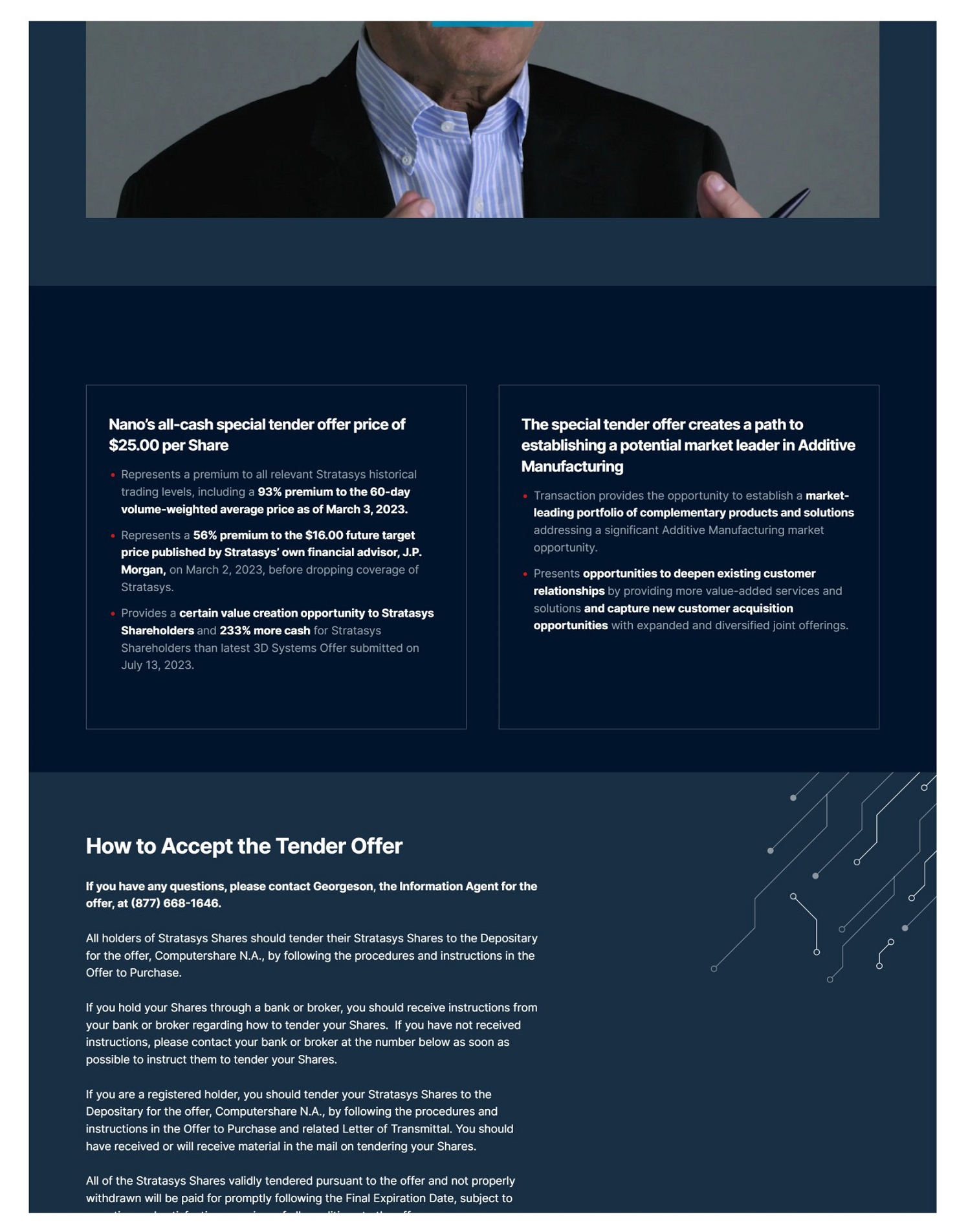 | o | The increased price represents a significant premium to all relevant Stratasys historical trading levels, including a 93% premium to the unaffected 60-day average share price4. Nano’s special tender offer is the most compelling offer for Stratasys shareholders and remains the only alternative available that provides certain, near-term cash value at a significant premium and the quickest path for Stratasys shareholders to realize value. |