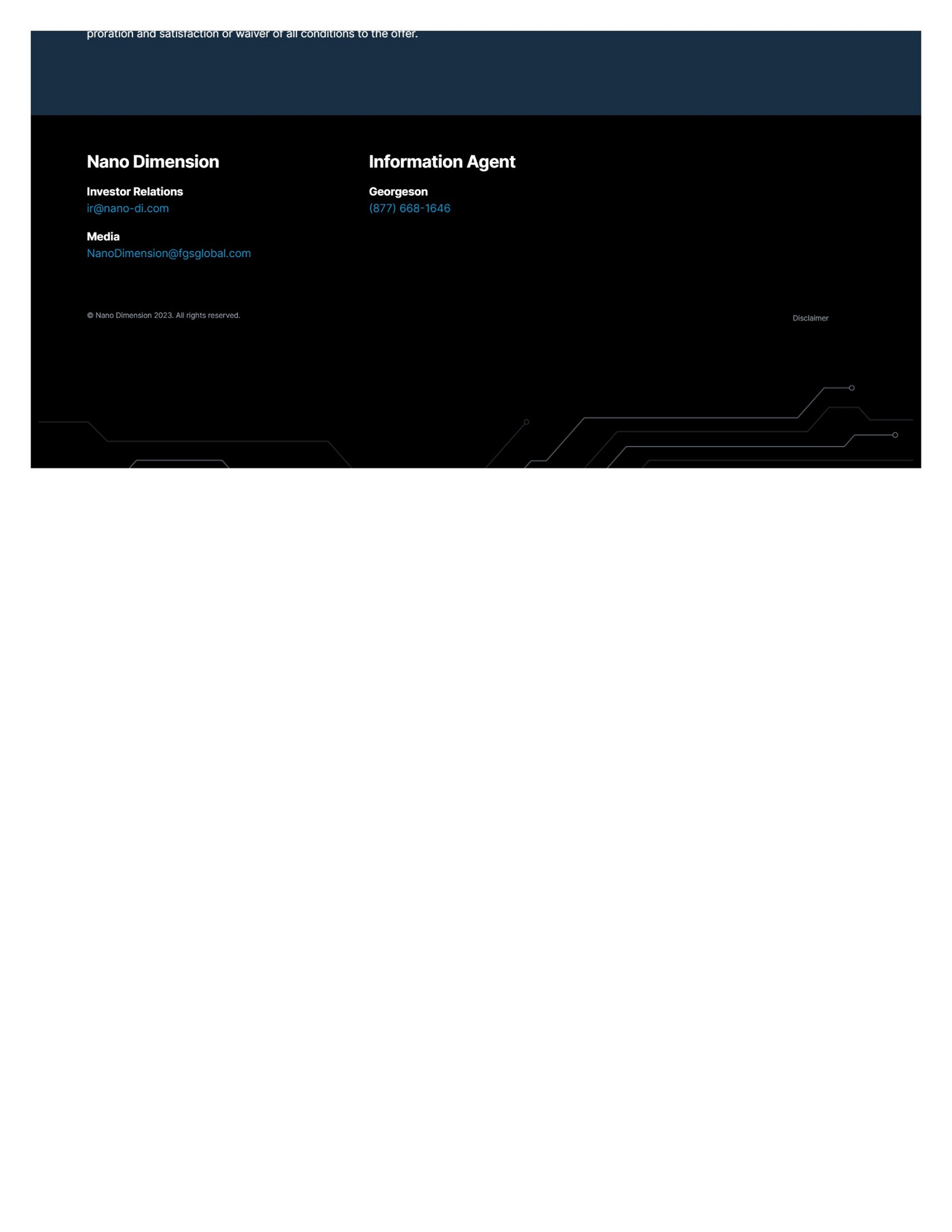 This press release contains forward-looking statements within the meaning of the “safe harbor” provisions of the Private Securities Litigation Reform Act of 1995 and other Federal securities laws. Words such as “expects,” “anticipates,” “intends,” “plans,” “believes,” “seeks,” “estimates,” and similar expressions or variations of such words are intended to identify forward-looking statements. For example, Nano Dimension is using forward-looking statements in this press release when it discusses its plans to support a review of strategic alternatives to further enhance Stratasys shareholder value (including through industry consolidation, possibly through a negotiated combination with 3D Systems following the successful completion of the special tender offer, and completing a transaction for all of Stratasys following the successful completion of the special tender offer), the potential benefits and advantages of the special tender offer, the expiration time and date for the special tender offer, and the comparative benefits of the Company’s tender offer weighed against the currently available alternative transactions offered to Stratasys shareholders by third parties. Because such statements deal with future events and are based on Nano Dimension’s current expectations, they are subject to various risks and uncertainties. The completion of the special tender offer would be subject to certain conditions as described in the tender offer materials, including the offer to purchase, a related letter of transmittal and other tender offer documents, as amended and supplemented. Actual results, performance, or achievements of Nano Dimension could differ materially from those described in or implied by the statements in this press release. The forward-looking statements contained or implied in this press release are subject to other risks and uncertainties, including those discussed under the heading “Risk Factors” in Nano Dimension’s annual report on Form 20-F filed with the SEC on March 30, 2023, and in any subsequent filings with the SEC. Except as otherwise required by law, Nano Dimension undertakes no obligation to publicly release any revisions to these forward-looking statements to reflect events or circumstances after the date hereof or to reflect the occurrence of unanticipated events. References and links to websites have been provided as a convenience, and the information contained on such websites is not incorporated by reference into this press release. Nano Dimension is not responsible for the contents of third-party websites.