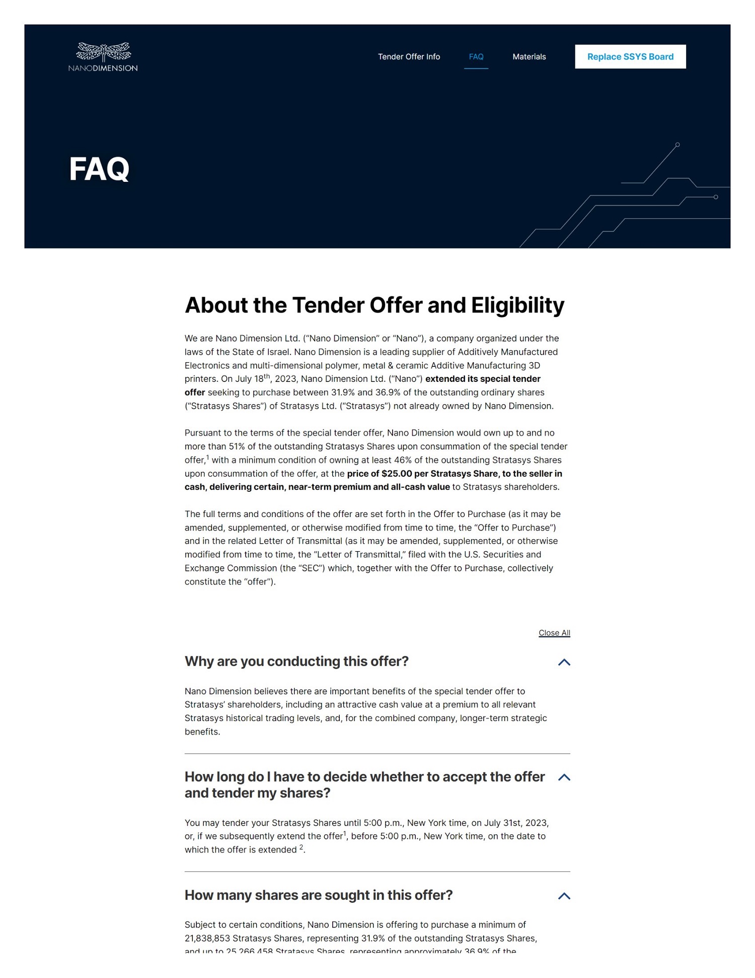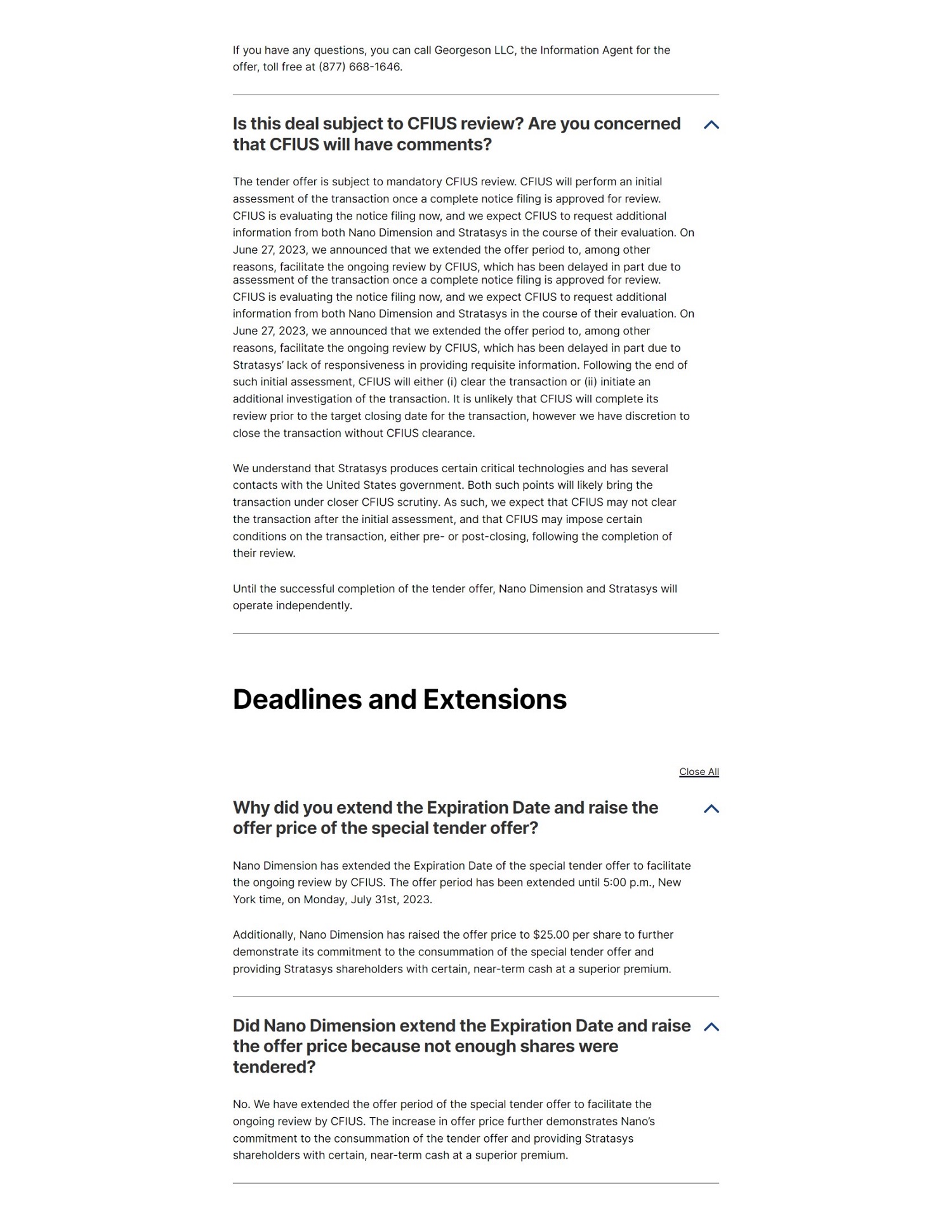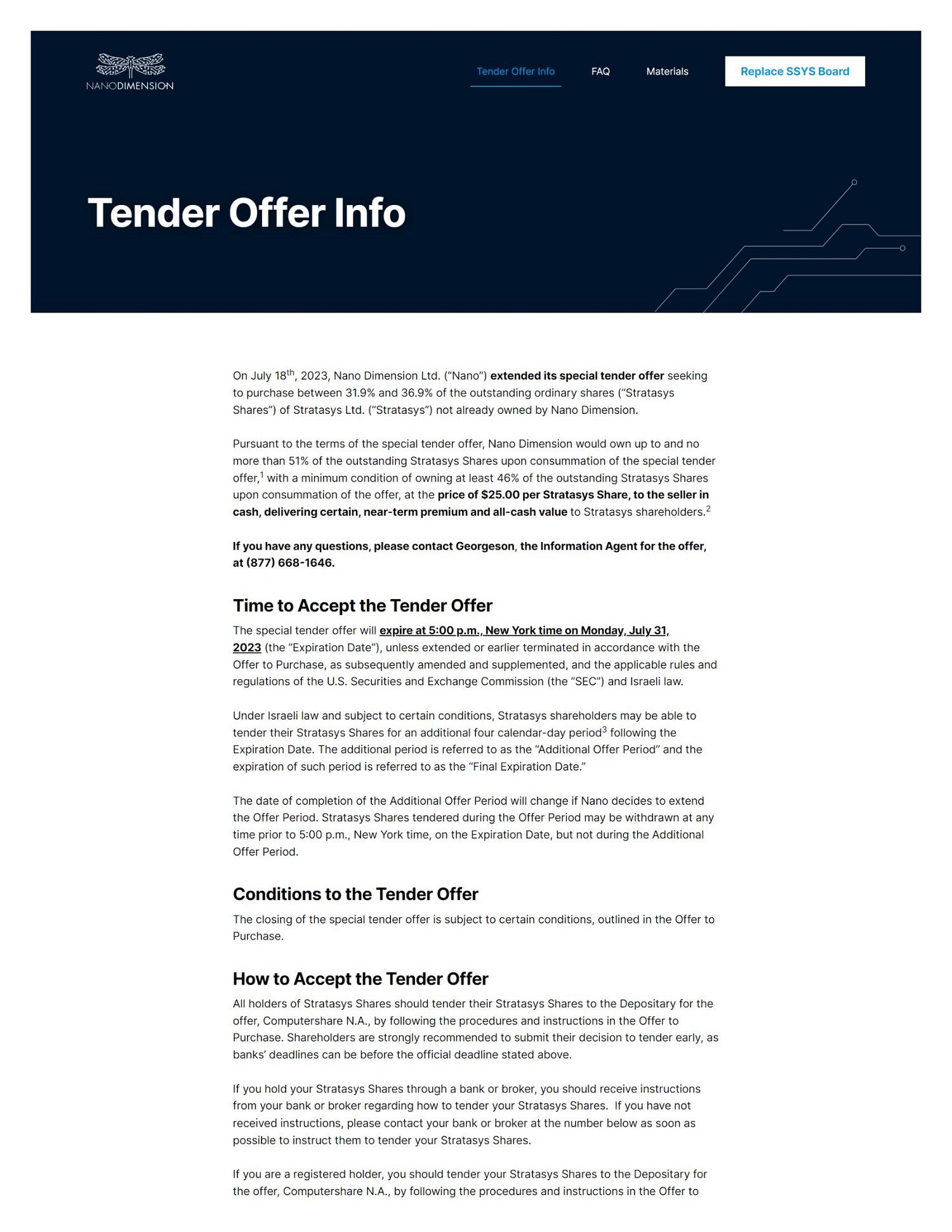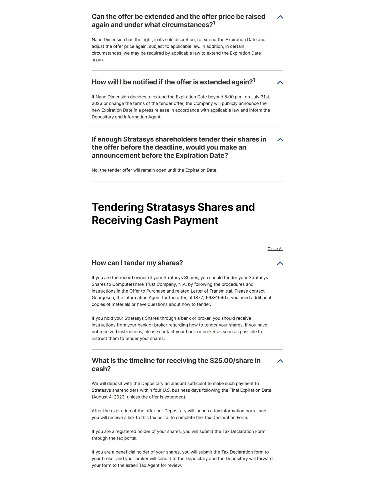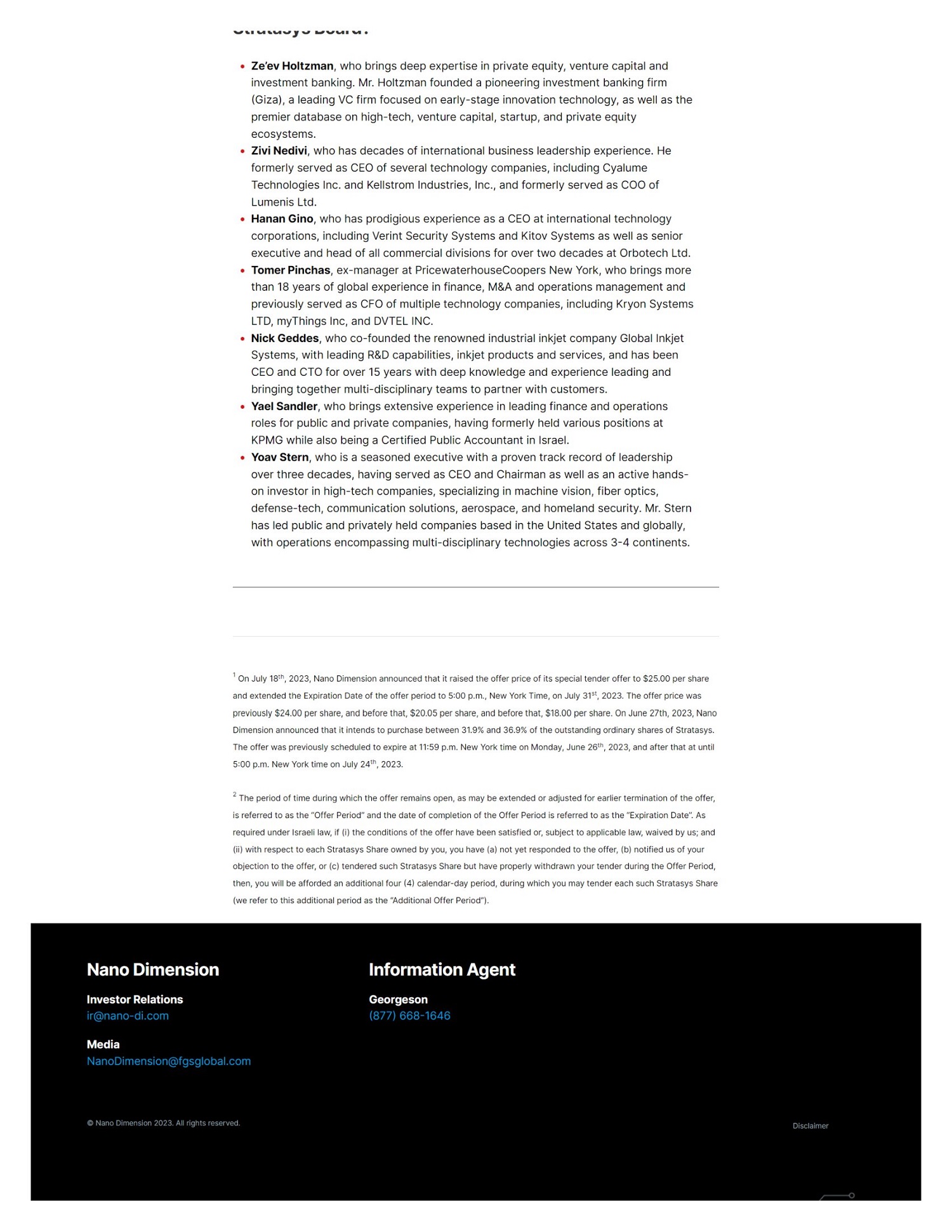 Nano is now increasing the Offer Price from $24.00 to $25.00 per Stratasys Share, to the seller in cash, less any required withholding taxes and without interest, upon the terms and subject to the conditions set forth in the Offer Documents. Nano has also extended the Offer Period to 5:00 p.m., New York time, on July 31, 2023, unless the offer is further extended, or earlier terminated. The Depositary has advised Nano that, as of 5:00 p.m., New York time, on July 17, 2023, 4,100,607 Stratasys Shares had been validly tendered and not properly withdrawn pursuant to the offer.