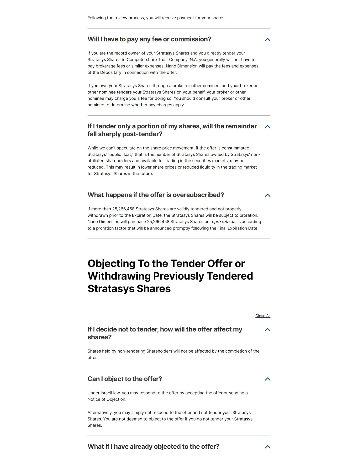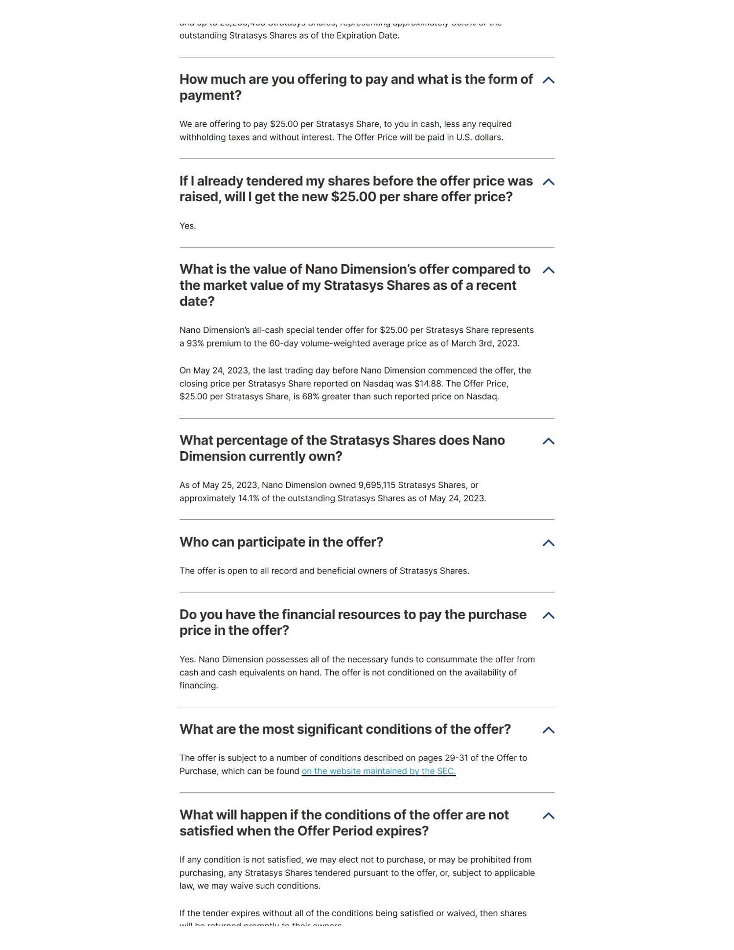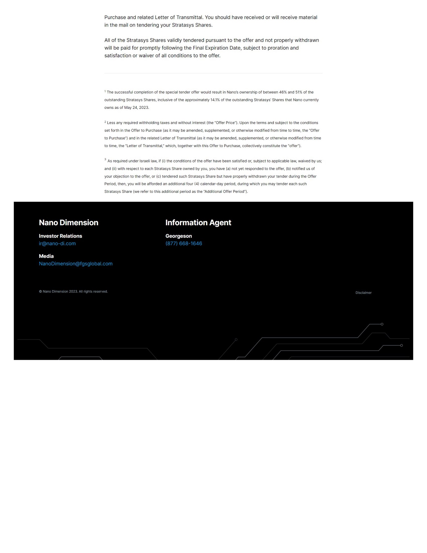 “As of May 25, 2023, Nano beneficially owned 9,695,115 Stratasys Shares, or approximately 14.1% of the outstanding Stratasys Shares as of May 24, 2023. See “Introduction” and Section 17 – “Conditions of the Offer”.”