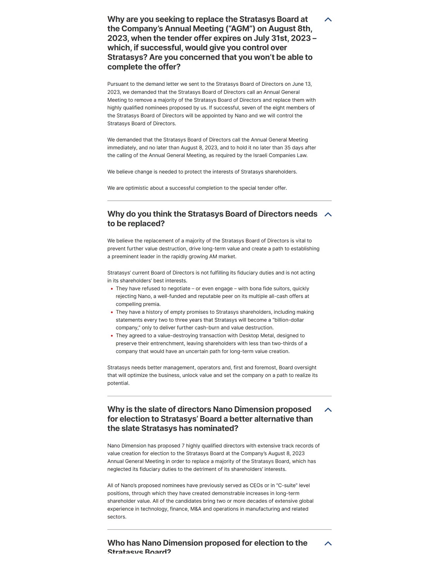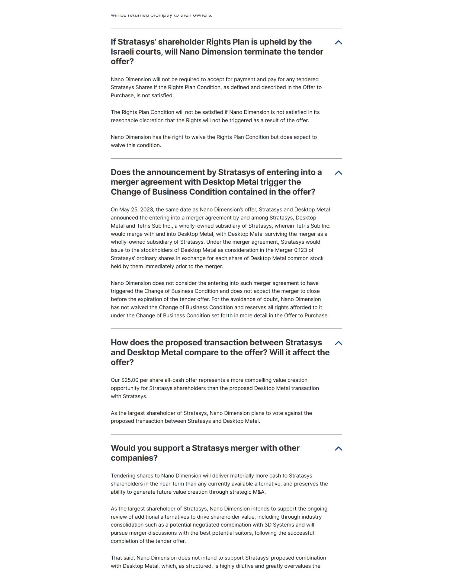 “Nano is conducting a detailed review of Stratasys and its assets, corporate structure, capitalization, operations, properties, policies, management and personnel, and will consider which changes would be desirable in light of the circumstances that exist upon completion of the offer. Nano will continue to evaluate the business and operations of Stratasys during the pendency of the offer. On June 13, 2023, we sent a letter to the Stratasys Board to demand that they call an extraordinary general meeting of Stratasys shareholders to remove a majority of the board of directors and replace them with highly qualified nominees proposed by Nano; in response, Stratasys has included our seven proposed directors on the ballot for its next annual general meeting of Stratasys shareholders to be held on August 8, 2023. As the largest shareholder of Stratasys, Nano intends to support a review of strategic alternatives to further enhance shareholder value, including through industry consolidation. After the consummation of the offer, Nano intends to conduct a comprehensive review of Stratasys’s business, operations, capitalization and management with a view to optimizing development of Stratasys’s potential in conjunction with Stratasys’s existing businesses. Possible changes could include changes in Stratasys’s business, corporate structure, memorandum of association, articles of association, capitalization, management, SEC registration or Nasdaq listing. In addition, Nano intends to explore various industry consolidating transactions including, but not limited to, a negotiated combination of Stratasys with 3D Systems and acquiring the remaining outstanding Stratasys Shares that Nano will not already own after consummation of the offer as soon as practicable and permissible under applicable U.S. and Israeli law. Our plans may change based on further analysis and Nano and, after completion of the offer, the Stratasys Board may change their plans and intentions at any time, as deemed appropriate.”