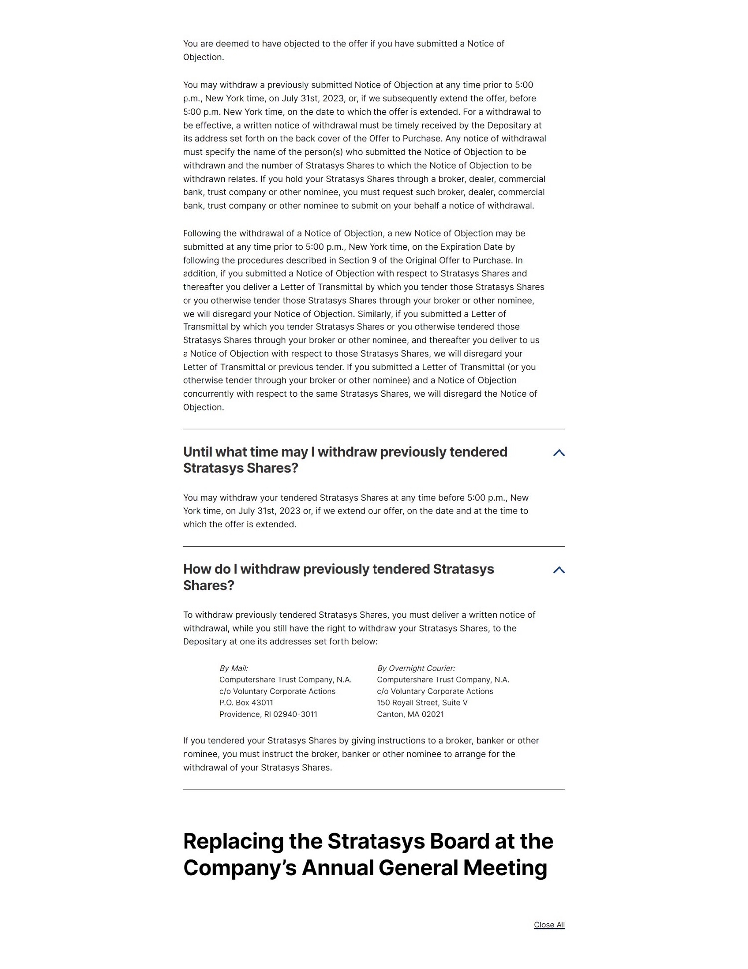 4. Withdrawal of Notice of Objection. You may withdraw a previously submitted Notice of Objection at any time prior to 5:00 p.m., New York time, on the Expiration Date. For a withdrawal to be effective, a written notice of withdrawal must be timely received by the Depositary at one of its addresses set forth on the front of this document. Any notice of withdrawal must specify the name of the person(s) who submitted the Notice of Objection to be withdrawn and the number of Stratasys Shares to which the Notice of Objection to be withdrawn relates. Following the withdrawal of a Notice of Objection, a new Notice of Objection may be submitted at any time prior to 5:00 p.m., New York time, on the Expiration Date by following the procedures described above. If Notices of Objection have been delivered pursuant to the procedures for book-entry transfer as set forth above, any notice of withdrawal must also specify the name and number of the account at DTC to be adjusted to reflect the withdrawal of such Stratasys Shares and otherwise comply with DTC’s procedures.