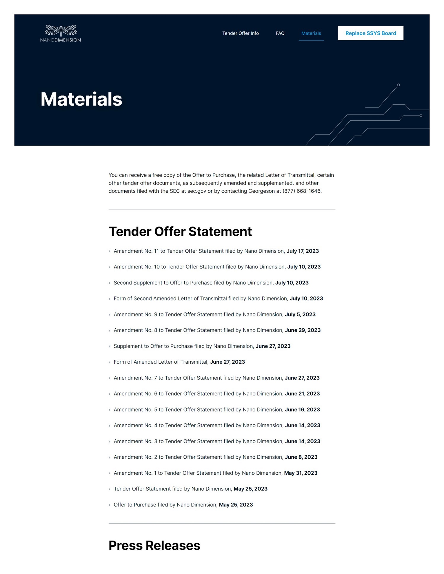 “On July 18, 2023, we issued a press release announcing: (i) the increased Offer Price of $25.00 per Stratasys Share, to the seller in cash, less any required withholding taxes and without interest; (ii) the extension of the Offer Period to 5:00 p.m., New York time, on July 31, 2023, unless further extended or earlier terminated and; (iii) Nano’s opposition to Stratasys’s proposed merger with Desktop Metal and recommendation to Stratasys shareholders to allow Nano, as a 51% holder of Stratasys Shares upon successful consummation of the offer, to (A) negotiate a combination of Stratasys with 3D Systems; and/or (B) purchase the remaining Stratasys Shares to reach 100% ownership as soon as practicable and permissible under U.S. and Israeli law.”