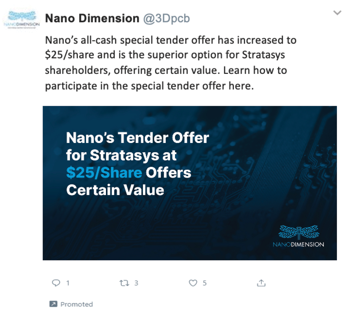 Nano Dimension has increased its special tender offer price (the “Offer”) to $25.00 per share from $24.00, in cash, less any required withholding taxes and without interest, to purchase between 31.9% and 36.9% of the outstanding ordinary shares of Stratasys.