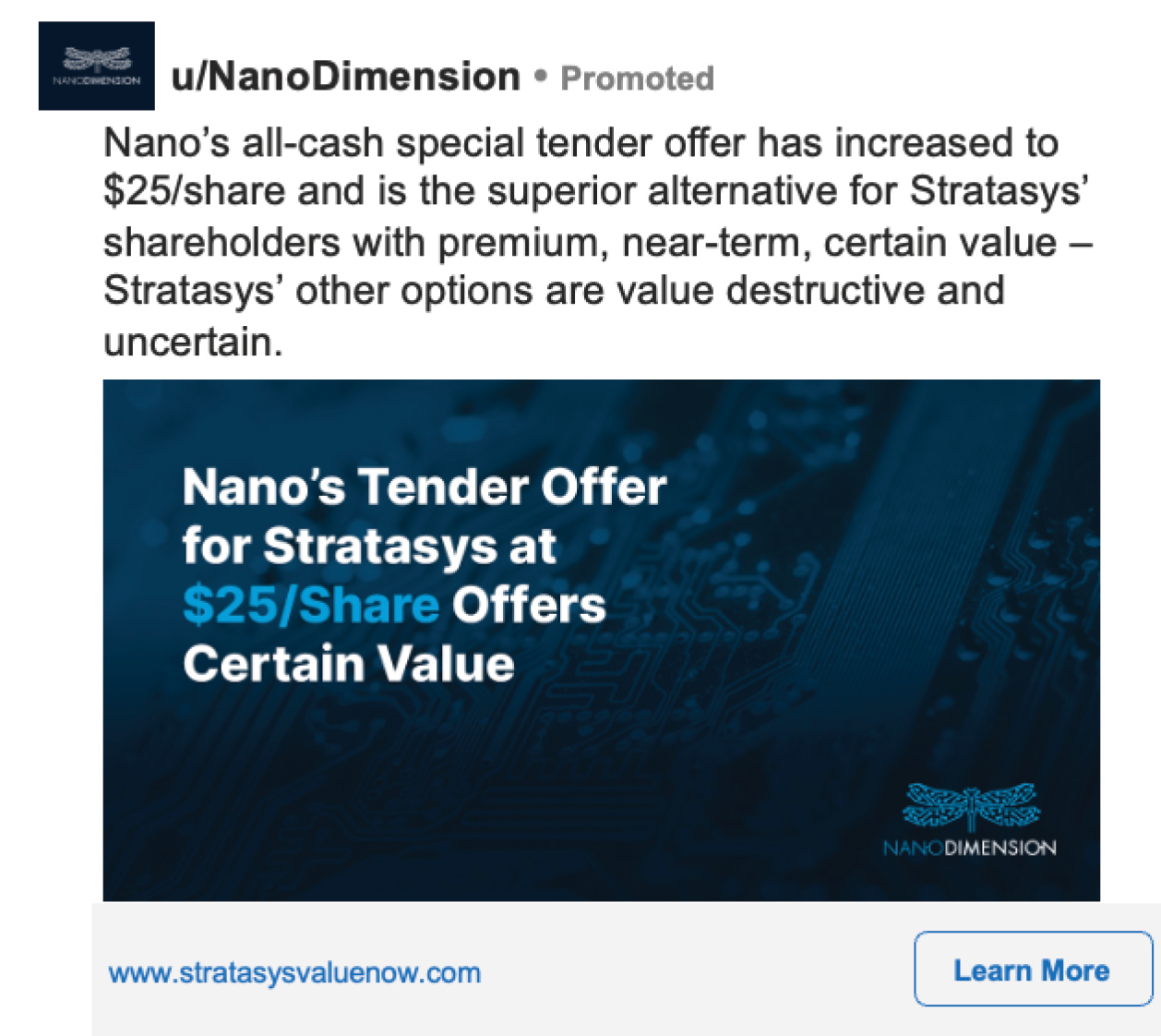 On July 18, 2023, Nano Dimension Ltd. posted the following messages via Display advertising: