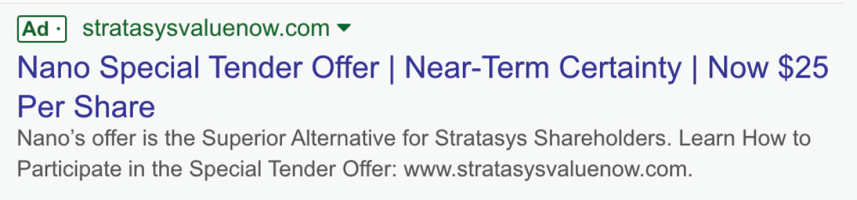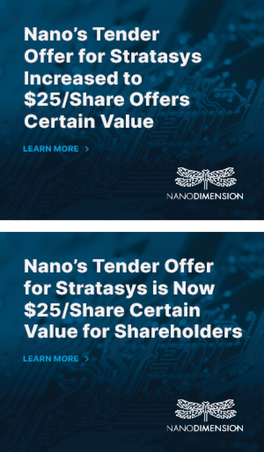 To learn more about Nano’s vision for Stratasys and details of its Special Tender Offer for Stratasys shares, visit www.StratasysValueNow.com