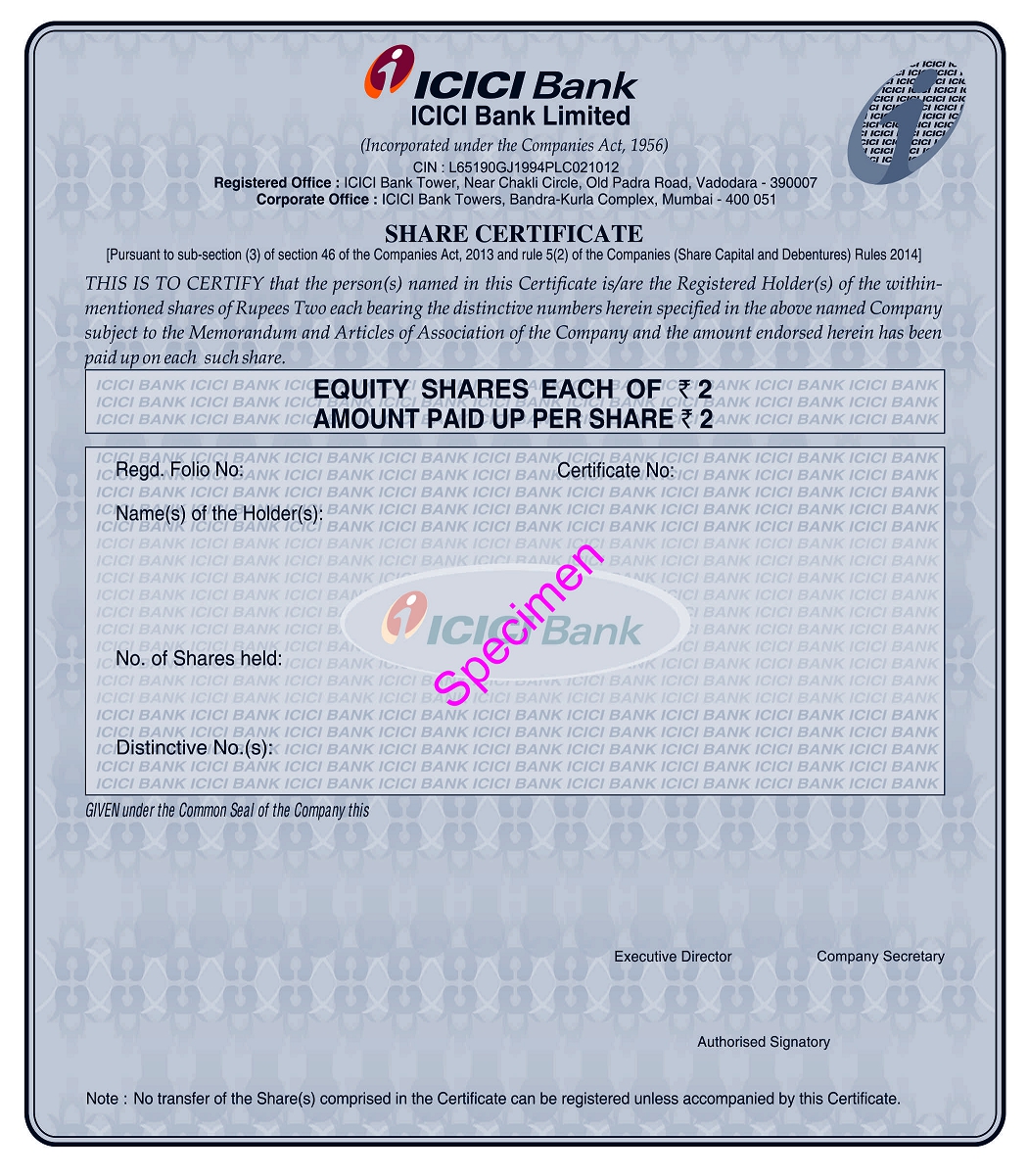 Office address: ICICI Bank Towers, Bandra-Kurla Complex, Mumbai – 400051, India