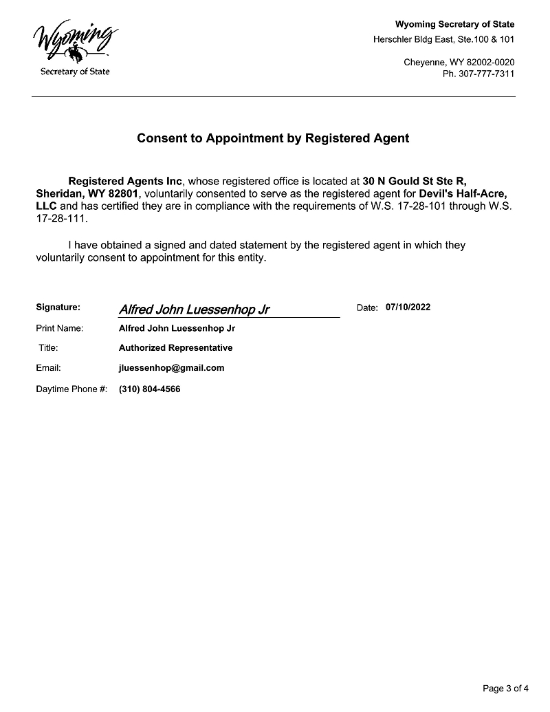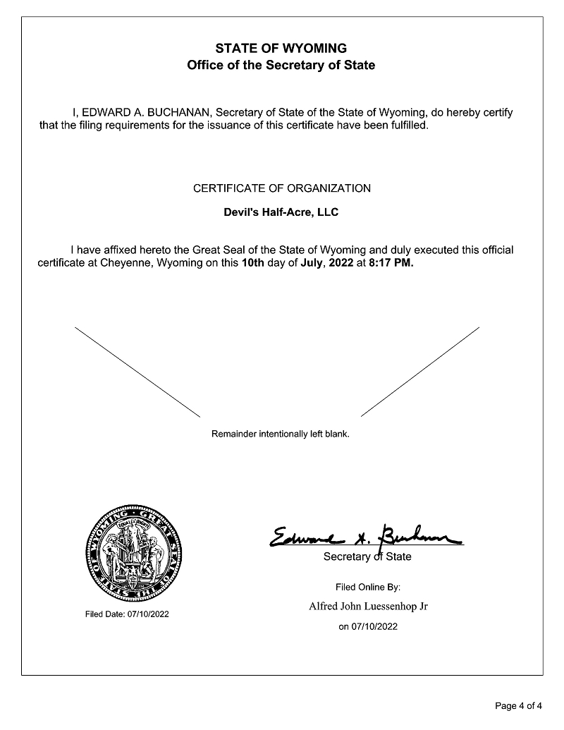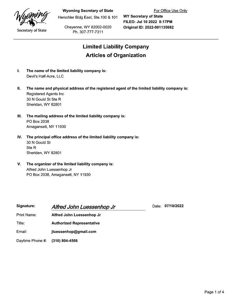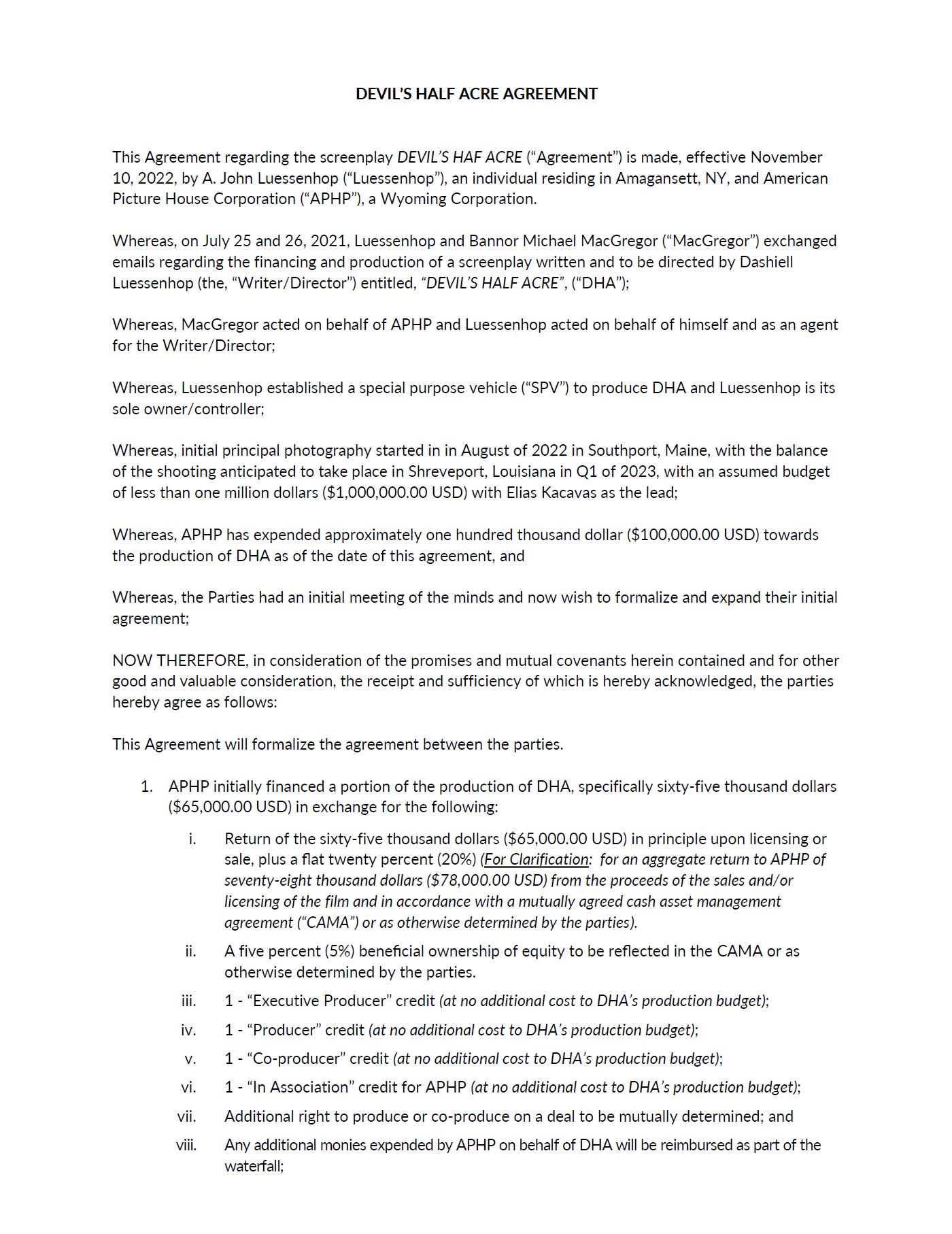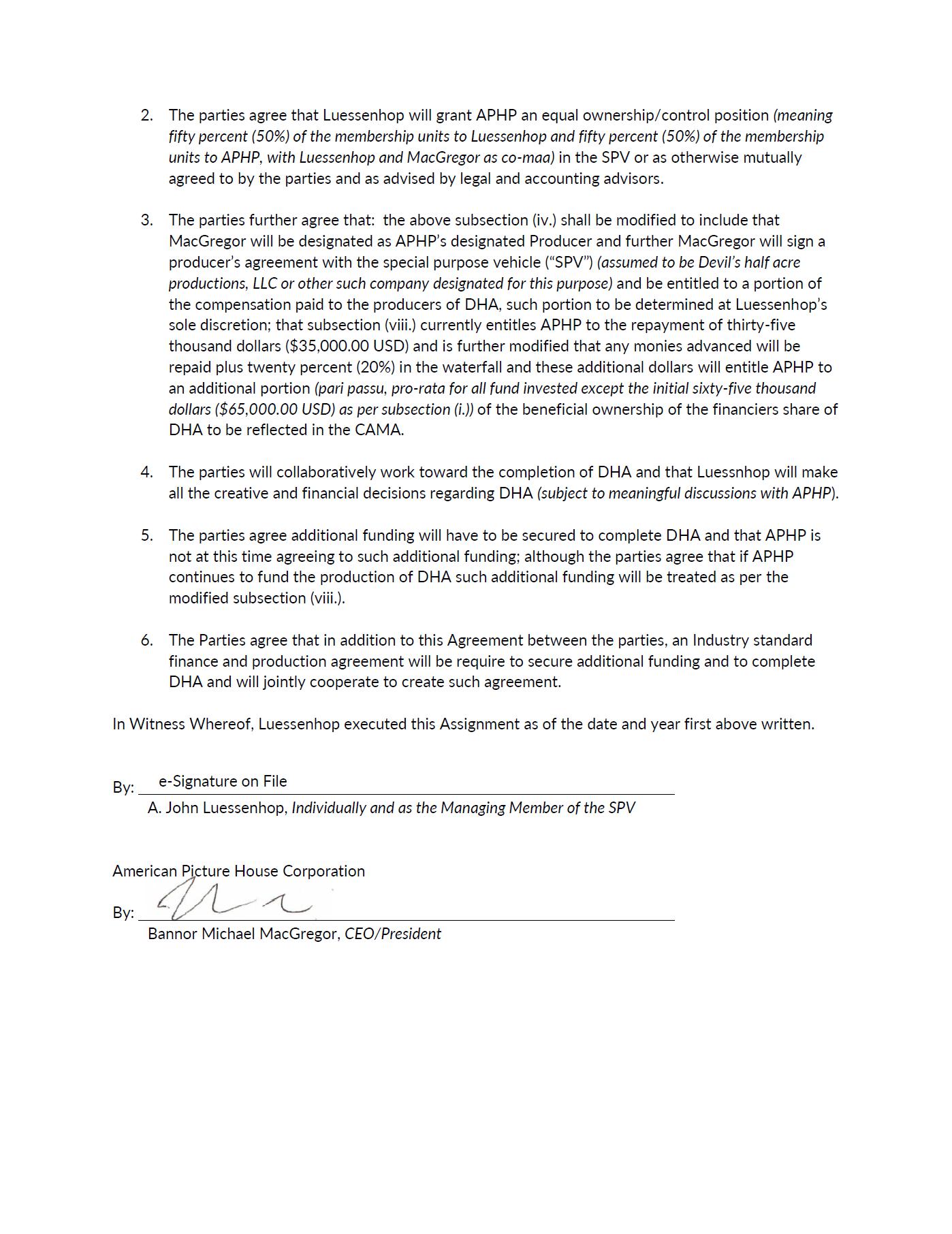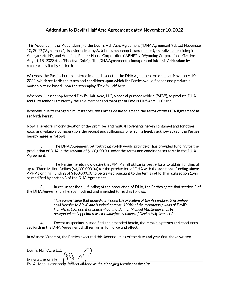 | ● | DEVIL’S HALF-ACRE written by Dashiell Luessenhop. These option rights expire in July 2024 with the ability to extend the option for an additional two (2) years. We are currently in pre-production of DEVIL’S HALF-ACRE including finalizing the script, hiring film crew, location scouting, determining equipment and finalizing the proposed budget. Additionally, on August 18th, 2023, APHP has acquired a Special Purpose Vehicle (“SPV”) called Devil’s Half-Acre Productions, LLC, for the specific purpose of producing the feature film. APH owns 100% of this SPV; and | |