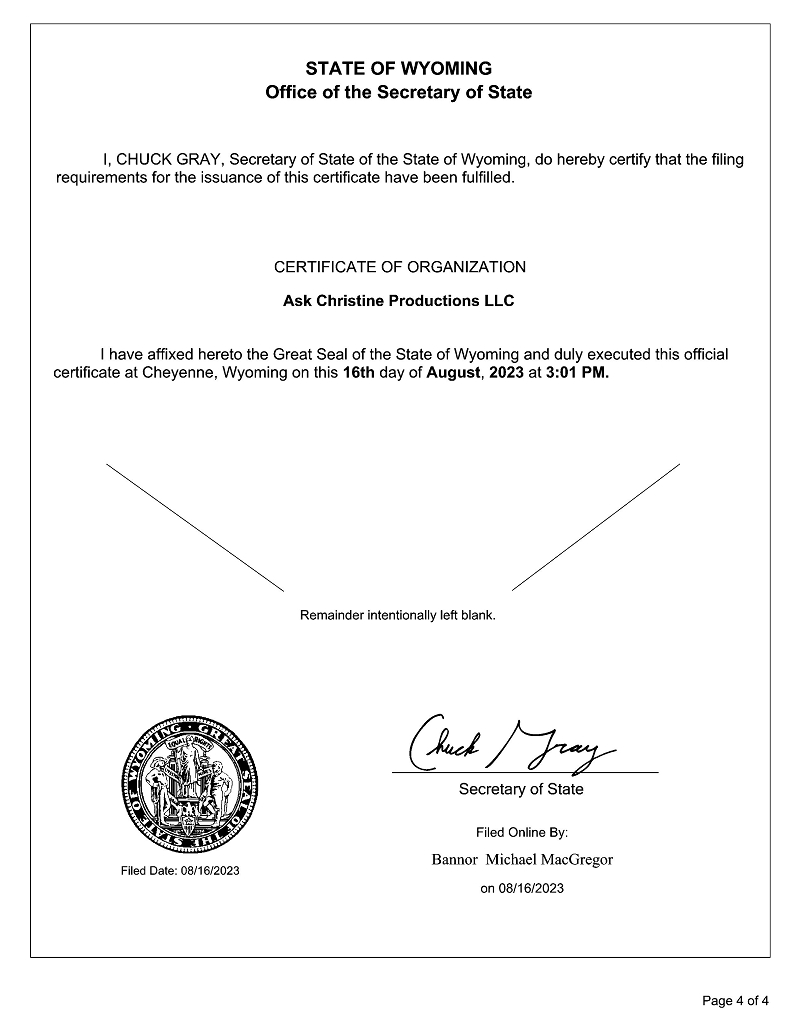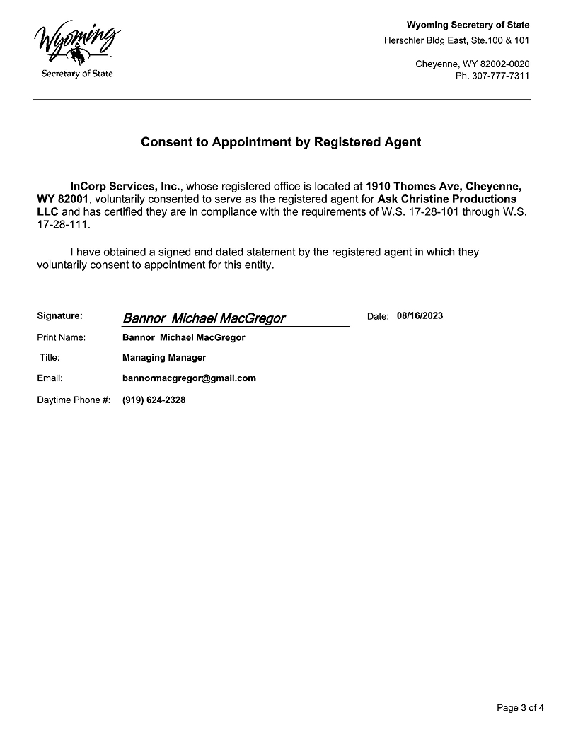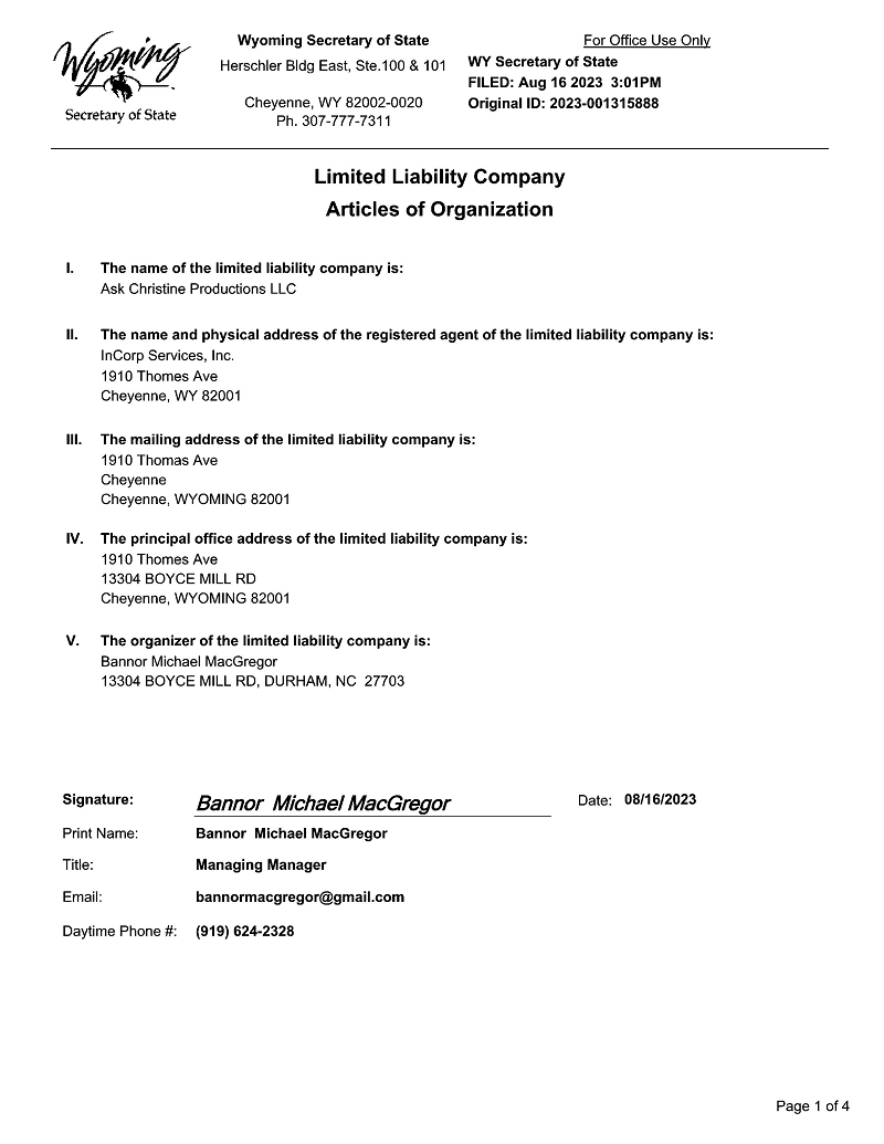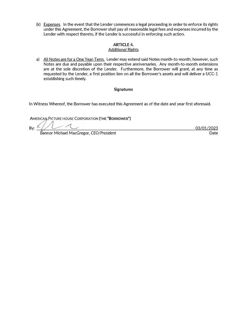 | ● | ASK CHRISTINE, a screenplay written by Danielle Silvie Gershberg. These option rights expire in March 2024 with the ability to extend the option for an additional two (2) years. We are currently in pre-production of ASK CHRISTINE including finalizing the script, hiring film crew, location scouting, determining equipment and finalizing the proposed budget. Additionally, APHP has established a SPV called Ask Christine Productions, LLC, for the specific purpose of producing the feature film. APH owns 100% of this SPV. This SPV has filed a Form V2.3 with the Screen Actors Guild (“SAG”) for an interim contract to enable APH to begin filming and utilizing SAG actors; and | |