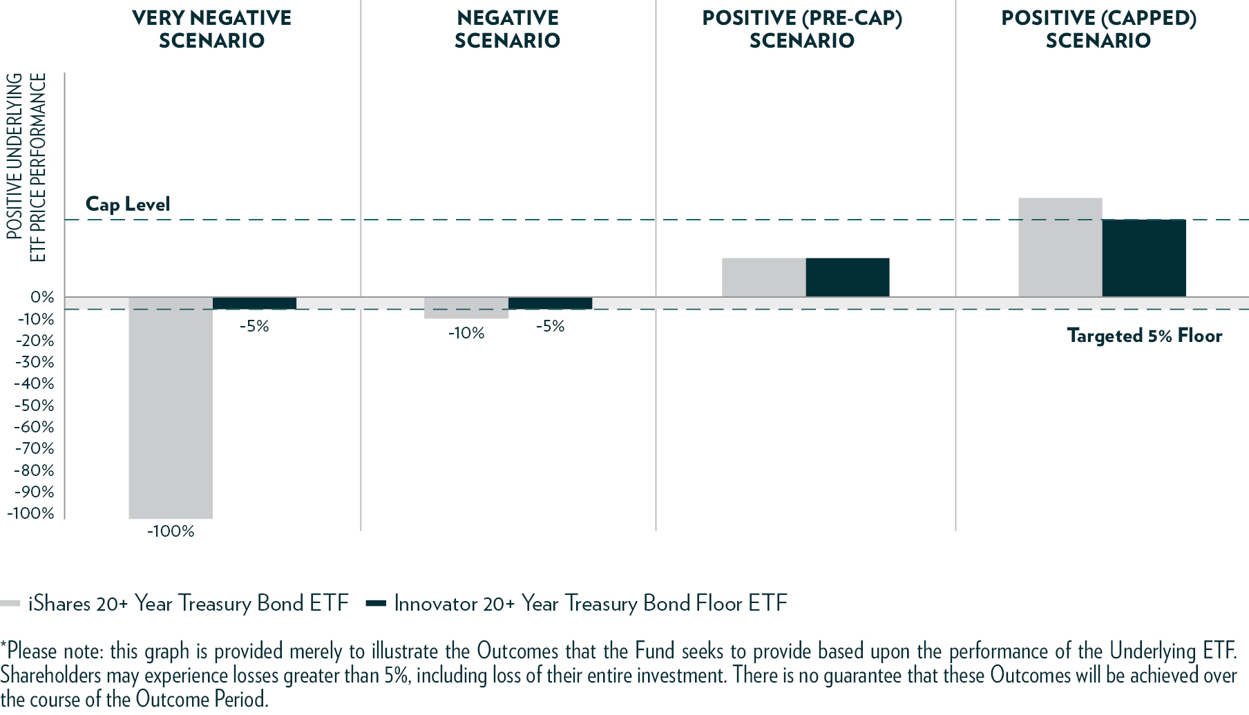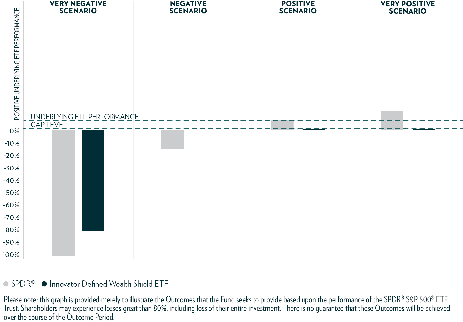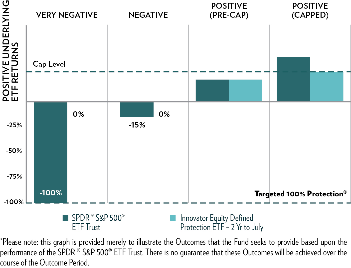 The Fund seeks to generate returns that match the Underlying ETF, up to the Cap (discussed in detail below), while limiting downside losses. The two hypothetical graphical illustrations provided below are designed to illustrate the Outcomes that the Fund seeks to provide for investors who hold Fund Shares for the entirety of the Outcome Period. There is no guarantee that the