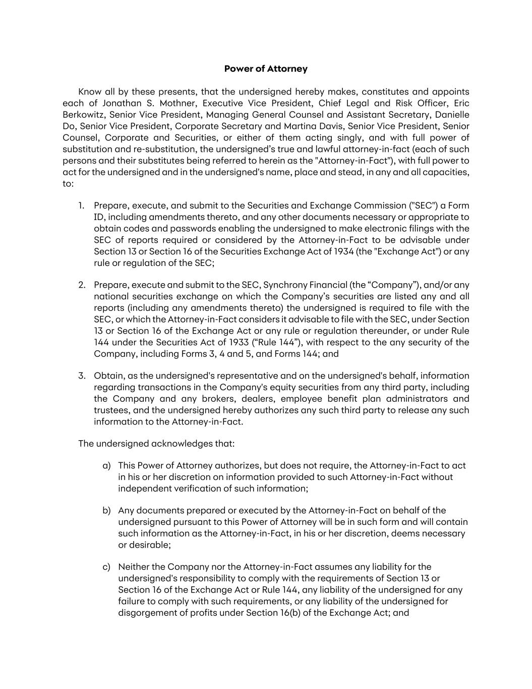 Power of Attorney Know all by these presents, that the undersigned hereby makes, constitutes and appoints each of Jonathan S. Mothner, Executive Vice President, Chief Legal and Risk Officer, Eric Berkowitz, Senior Vice President, Managing General Counsel and Assistant Secretary, Danielle Do, Senior Vice President, Corporate Secretary and Martina Davis, Senior Vice President, Senior Counsel, Corporate and Securities, or either of them acting singly, and with full power of substitution and re-substitution, the undersigned’s true and lawful attorney-in-fact (each of such persons and their substitutes being referred to herein as the "Attorney-in-Fact"), with full power to act for the undersigned and in the undersigned's name, place and stead, in any and all capacities, to: 1. Prepare, execute, and submit to the Securities and Exchange Commission ("SEC") a Form ID, including amendments thereto, and any other documents necessary or appropriate to obtain codes and passwords enabling the undersigned to make electronic filings with the SEC of reports required or considered by the Attorney-in-Fact to be advisable under Section 13 or Section 16 of the Securities Exchange Act of 1934 (the "Exchange Act") or any rule or regulation of the SEC; 2. Prepare, execute and submit to the SEC, Synchrony Financial (the “Company”), and/or any national securities exchange on which the Company’s securities are listed any and all reports (including any amendments thereto) the undersigned is required to file with the SEC, or which the Attorney-in-Fact considers it advisable to file with the SEC, under Section 13 or Section 16 of the Exchange Act or any rule or regulation thereunder, or under Rule 144 under the Securities Act of 1933 (“Rule 144”), with respect to the any security of the Company, including Forms 3, 4 and 5, and Forms 144; and 3. Obtain, as the undersigned's representative and on the undersigned's behalf, information regarding transactions in the Company's equity securities from any third party, including the Company and any brokers, dealers, employee benefit plan administrators and trustees, and the undersigned hereby authorizes any such third party to release any such information to the Attorney-in-Fact. The undersigned acknowledges that: a) This Power of Attorney authorizes, but does not require, the Attorney-in-Fact to act in his or her discretion on information provided to such Attorney-in-Fact without independent verification of such information; b) Any documents prepared or executed by the Attorney-in-Fact on behalf of the undersigned pursuant to this Power of Attorney will be in such form and will contain such information as the Attorney-in-Fact, in his or her discretion, deems necessary or desirable; c) Neither the Company nor the Attorney-in-Fact assumes any liability for the undersigned's responsibility to comply with the requirements of Section 13 or Section 16 of the Exchange Act or Rule 144, any liability of the undersigned for any failure to comply with such requirements, or any liability of the undersigned for disgorgement of profits under Section 16(b) of the Exchange Act; and