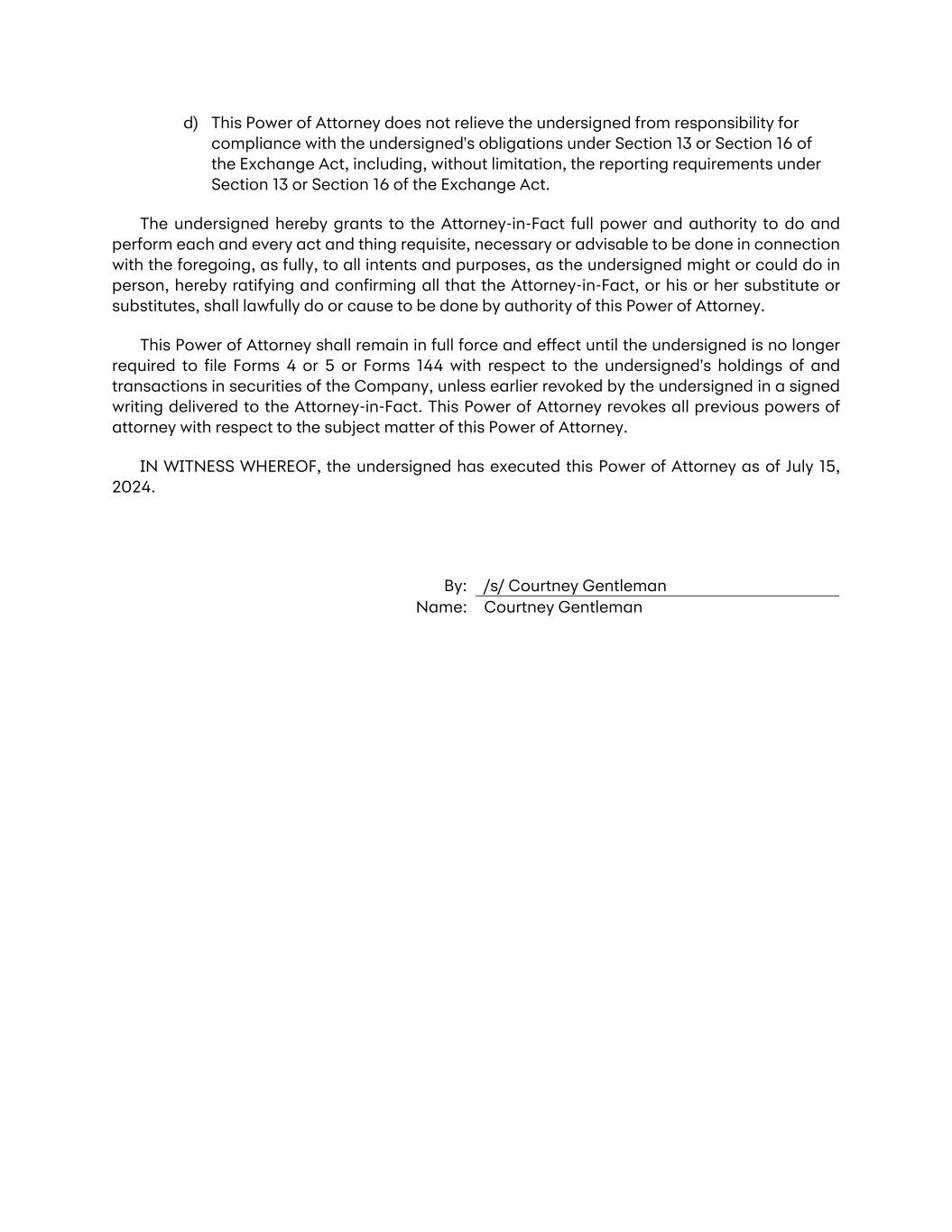 d) This Power of Attorney does not relieve the undersigned from responsibility for compliance with the undersigned's obligations under Section 13 or Section 16 of the Exchange Act, including, without limitation, the reporting requirements under Section 13 or Section 16 of the Exchange Act. The undersigned hereby grants to the Attorney-in-Fact full power and authority to do and perform each and every act and thing requisite, necessary or advisable to be done in connection with the foregoing, as fully, to all intents and purposes, as the undersigned might or could do in person, hereby ratifying and confirming all that the Attorney-in-Fact, or his or her substitute or substitutes, shall lawfully do or cause to be done by authority of this Power of Attorney. This Power of Attorney shall remain in full force and effect until the undersigned is no longer required to file Forms 4 or 5 or Forms 144 with respect to the undersigned's holdings of and transactions in securities of the Company, unless earlier revoked by the undersigned in a signed writing delivered to the Attorney-in-Fact. This Power of Attorney revokes all previous powers of attorney with respect to the subject matter of this Power of Attorney. IN WITNESS WHEREOF, the undersigned has executed this Power of Attorney as of July 15, 2024. By: /s/ Courtney Gentleman Name: Courtney Gentleman