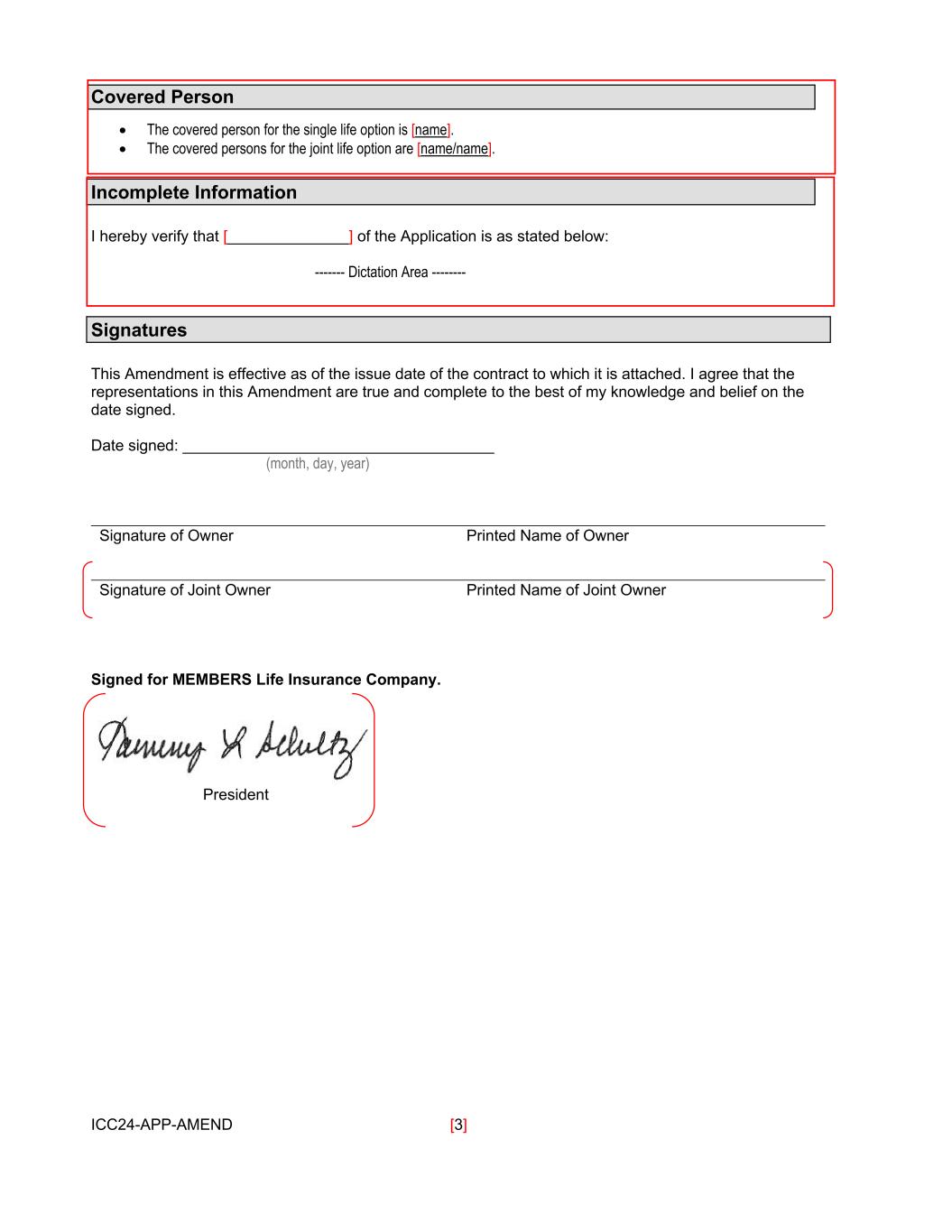 ICC24-APP-AMEND [1] [2000 Heritage Way, Waverly, Iowa 50677] Phone: [800.798.5500] [www.trustage.com/annuities] AMENDMENT TO ANNUITY APPLICATION IMPORTANT INFORMATION REGARDING YOUR CONTRACT COVERAGE Owner: [John Doe] [Contract Number: [123456789 ]] [Joint Owner: [Jane Doe] ] [Annuitant (if other than Owner): [James Doe] ] [Joint Annuitant (if other than Joint Owner): [Jimmy Doe] ] Date of Original Application: [October 1, 2024] I understand and agree that the application [and contract issued on the basis of the application] is amended as follows: Plan Option The Plan Option is [ ]. TruStageTM ZoneChoice Advantage Annuity Other – see Explanation of Variables Owner and Annuitant The Sex at Birth of the above named [Owner/Joint Owner/Annuitant/Joint Annuitant] is [male/female]. The date of birth of the above named [Owner/Joint Owner/Annuitant/Joint Annuitant] is [date]. The [Owner/Joint Owner/Annuitant/Joint Annuitant] of this contract is [name]. Other – see Explanation of Variables. Annuity Type and Payment Source The Annuity Type is [ ]. Non-qualified; Non-qualified Stretch Traditional IRA Roth IRA Simplified Employee Pension (SEP) IRA Inherited IRA – Traditional Inherited IRA – Roth Other – see Explanation of Variables The Payment Classification is: [ ]. Non-1035 Exchange 1035 Exchange Rollover Transfer Current Year Contribution Prior Year Contribution Roth Conversion Other – see Explanation of Variables The Source of Payment is [Source/Company Name], [Estimated Amount/Amount if by Check], [Existing Plan Type]. ICC24-APP-AMEND [2] Purchase Payment Allocation The Purchase Payment Allocation is as follows: [Crediting Strategy]. [Percentage] to [Allocation Option]. Floor with Participation Rate and Cap Rate Crediting Strategy _____% S&P 500, 1-Year Interest Term, [Floor] o Floor choices: 0%, -1%, -2%, -3%, -4%, -5%, -6%, -7%, -8%, -9%, -10% _____% Dimensional US Small Cap Value Systematic Index, 1-Year Interest Term, [Floor] o Floor choices: 0%, -1%, -2%, -3%, -4%, -5%, -6%, -7%, -8%, -9%, -10% _____% Barclays Risk Balanced Index, 1-Year Interest Term, [Floor] o Floor choices: 0%, -1%, -2%, -3%, -4%, -5%, -6%, -7%, -8%, -9%, -10% Buffer with Participation Rate and Cap Rate Crediting Strategy _____% S&P 500, 1-Year Interest Term, -10% Buffer _____% S&P 500, 6-Year Interest Term, -10% Buffer _____% S&P 500, 6-Year Interest Term, -20% Buffer _____% Dimensional US Small Cap Value Systematic Index, 1-Year Interest Term, -10% Buffer _____% Dimensional US Small Cap Value Systematic Index, 6-Year Interest Term, -10% Buffer _____% Dimensional US Small Cap Value Systematic Index, 6-Year Interest Term, -20% Buffer _____% Barclays Risk Balanced Index, 6-Year Interest Term, -10% Buffer _____% Barclays Risk Balanced Index, 6-Year Interest Term, -20% Buffer Boost with Participation Rate and Cap Rate Crediting Strategy _____% S&P 500, 6-Year Interest Term, 10% Protection Plus Rate _____% S&P 500, 6-Year Interest Term, 20% Protection Plus Rate _____% Dimensional US Small Cap Value Systematic Index, 6-Year Interest Term, 10% Protection Plus Rate _____% Dimensional US Small Cap Value Systematic Index, 6-Year Interest Term, 20% Protection Plus Rate _____% Barclays Risk Balanced Index, 6-Year Interest Term, 10% Protection Plus Rate _____% Barclays Risk Balanced Index, 6-Year Interest Term, 20% Protection Plus Rate Buffer with Dual Step Crediting Strategy _____% S&P 500, 6-Year Interest Term, -10% Buffer _____% S&P 500, 6-Year Interest Term, -20% Buffer For the Fixed Account Crediting Strategy _____% Fixed Account, 1-Year Interest Term Other – see Explanation of Variables
