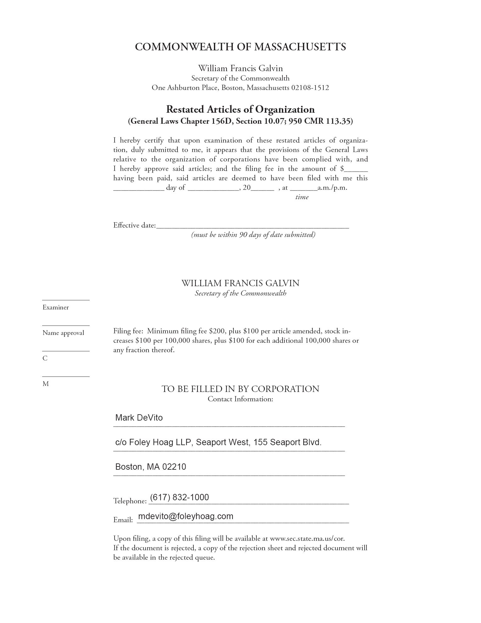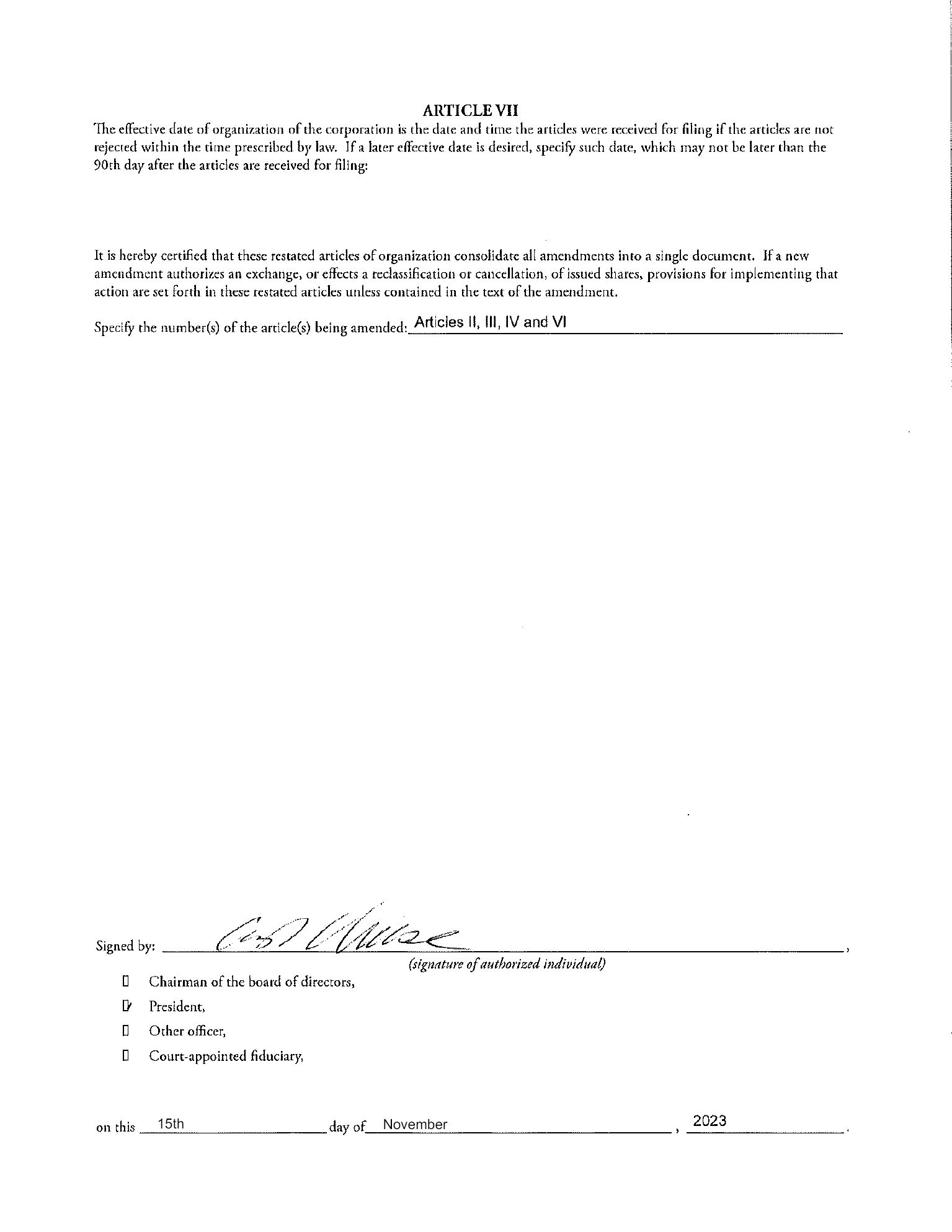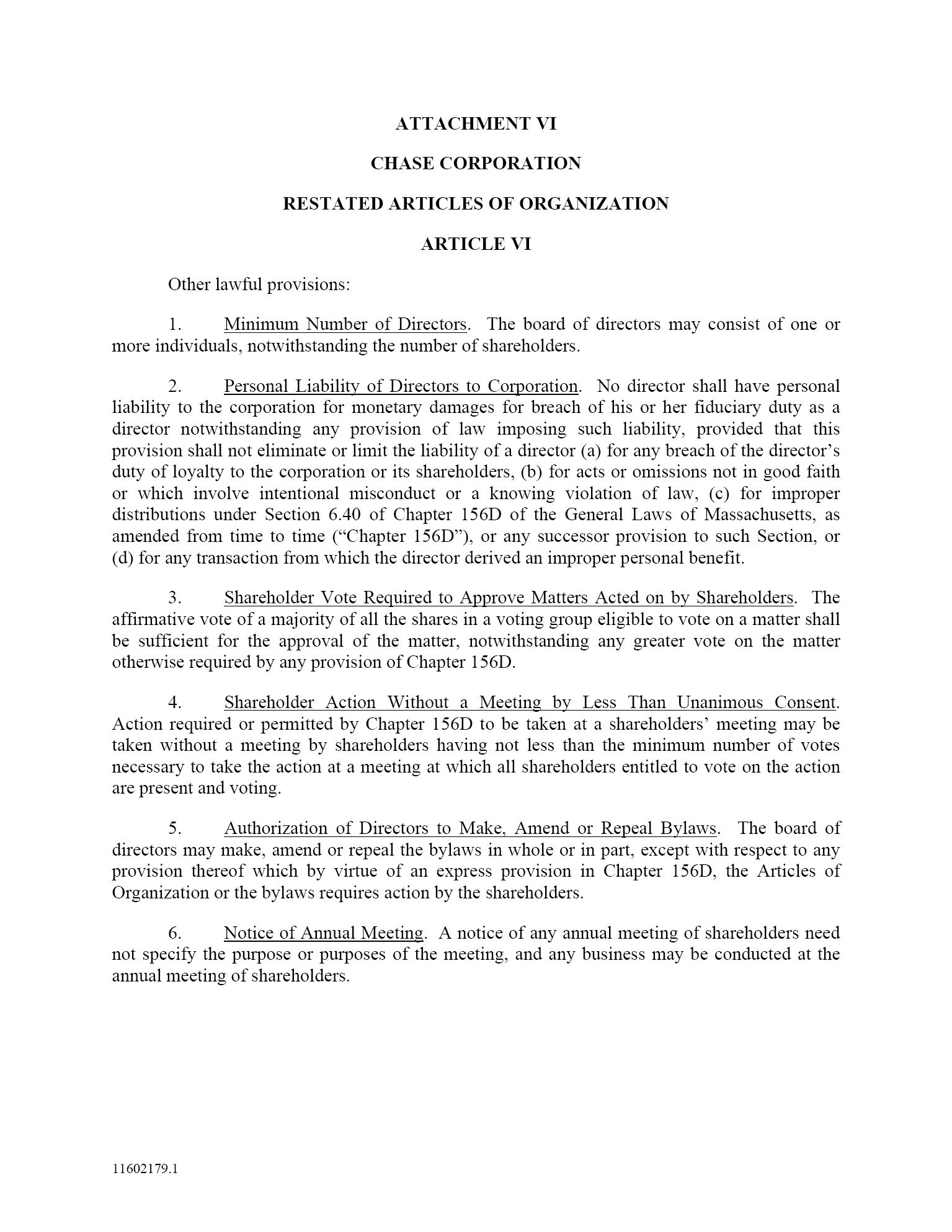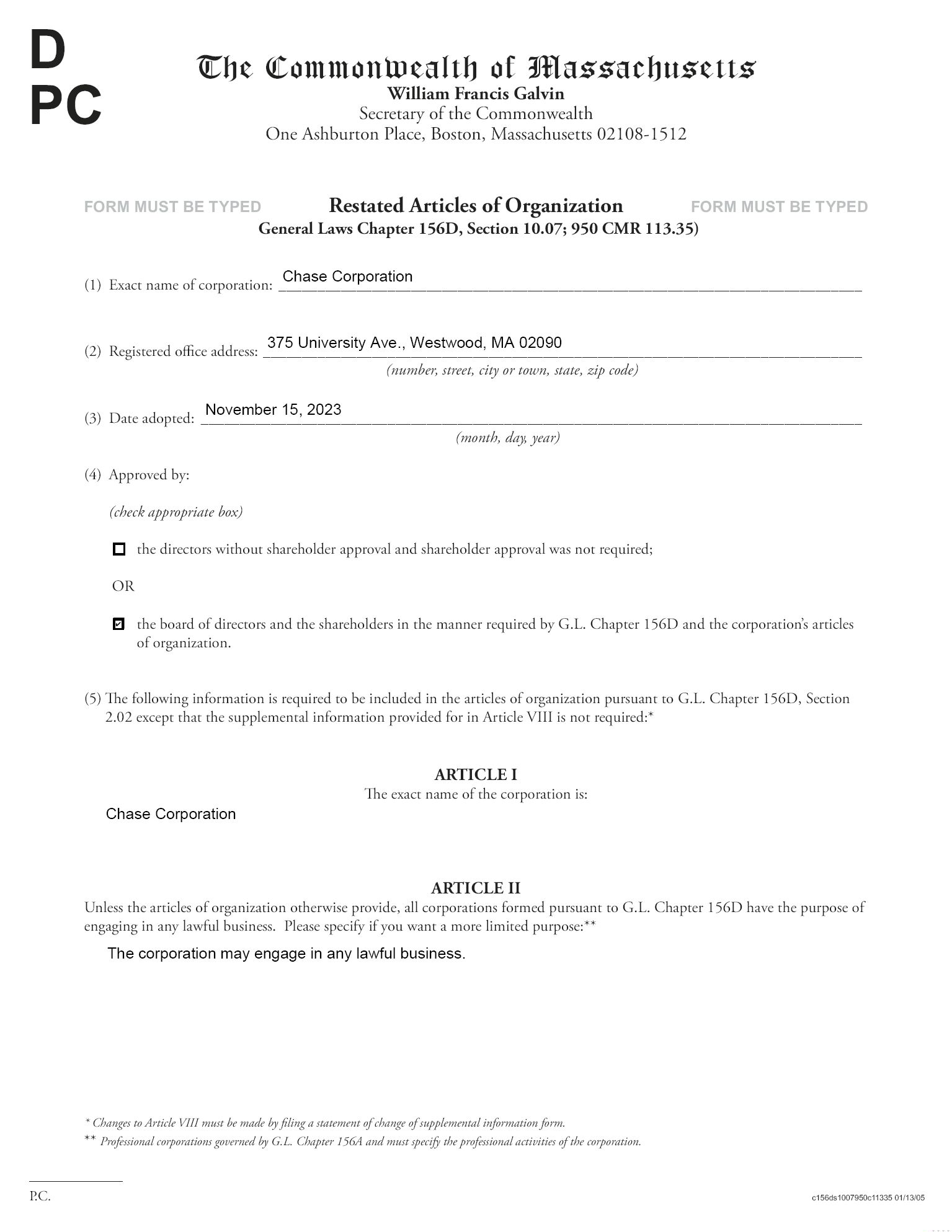 Restated Articles of Organization of Chase Corporation, effective as of November 15, 2023