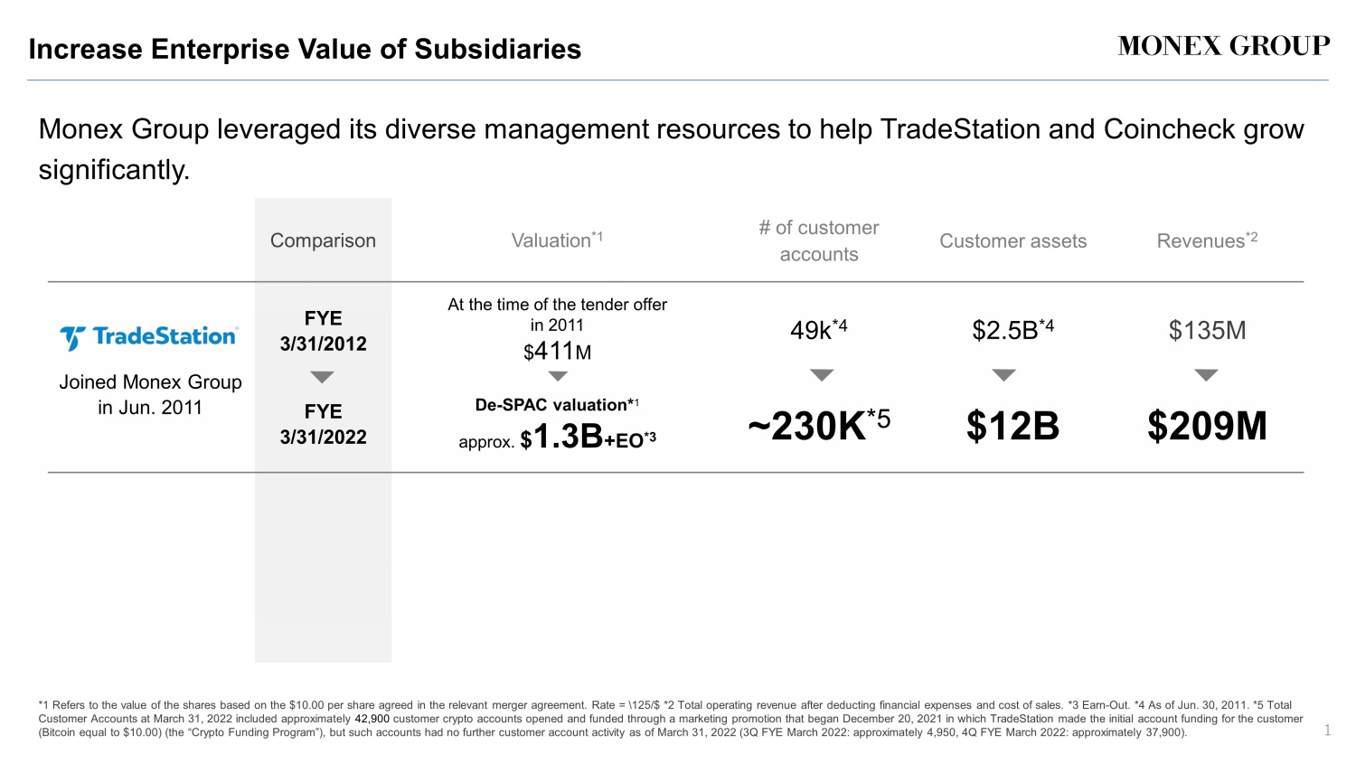 Increase Enterprise Value of Subsidiaries Monex Group leveraged its diverse management resources to help TradeStation and Coincheck grow significantly. Comparison Valuation *1 # of customer accounts Customer assets Revenues *2 Joined Monex Group in Jun. 2011 FYE 3/31/2012 FYE 3/31/2022 At the time of the tender offer in 2011 $ 411 M 49k *4 $2.5B *4 $135M De - SPAC valuation* 1 approx. $ 1.3B +EO *3 ~ 230K * 5 $12B $209M * 1 Refers to the value of the shares based on the $ 10.00 per share agreed in the relevant merger agreement. Rate = \ 125/$ *2 Total operating revenue after deducting financial expenses and cost of sales. *3 Earn - Out . *4 As of Jun. 30, 2011. * 5 Total Customer Accounts at March 31, 2022 included approximately 42,900 customer crypto accounts opened and funded through a marketing promotion that began December 20, 2021 in which TradeStation made the initial account funding for the customer (Bitcoin equal to $10.00) (the “ Crypto Funding Program”), but such accounts had no further customer account activity as of March 31, 2022 (3Q FYE March 2022: approximately 4,950, 4Q FYE March 2022: approximately 37,900). * 6 As of Mar. 31, 2018. 1