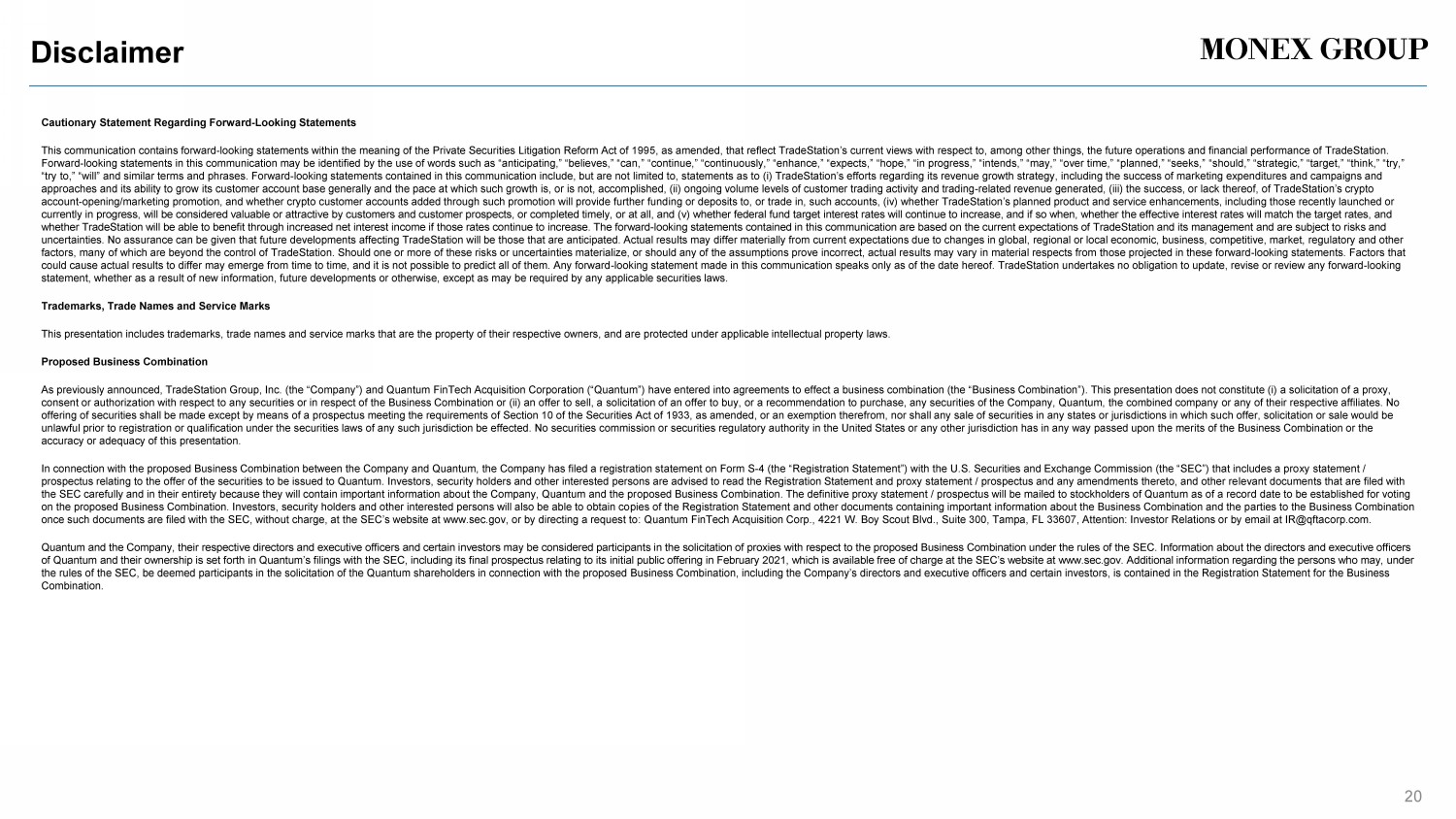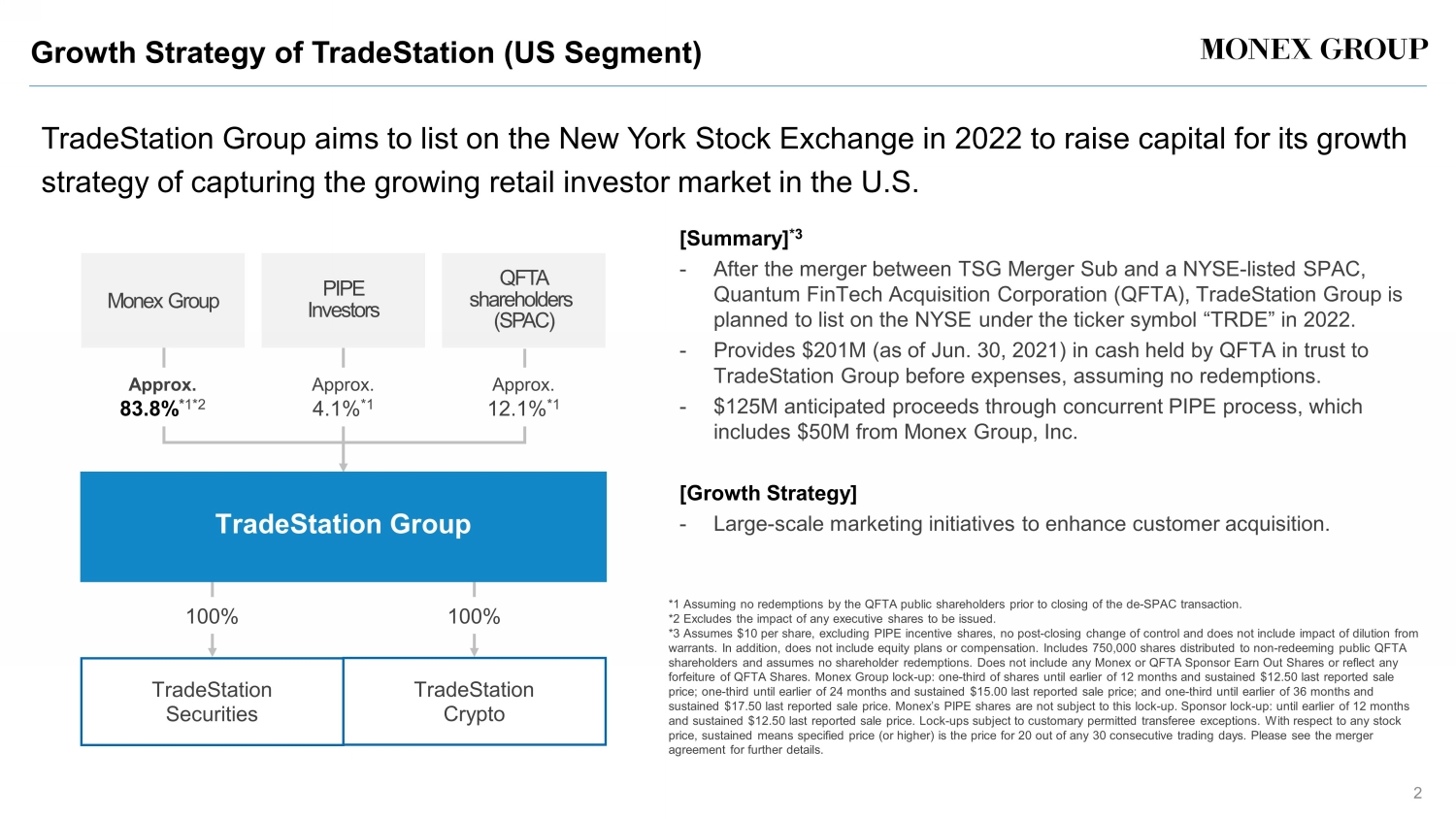 Growth Strategy of TradeStation (US Segment ) TradeStation Group aims to list on the New York Stock Exchange in 2022 to raise capital for its growth strategy of capturing the growing retail investor market in the U.S . [Summary ] *3 - After the merger between TSG Merger Sub and a NYSE - listed SPAC, Quantum FinTech Acquisition Corporation (QFTA), TradeStation Group is planned to list on the NYSE under the ticker symbol “TRDE” in 2022. - Provides $ 201M (as of Jun. 30, 2021) in cash held by QFTA in trust to TradeStation Group before expenses, assuming no redemptions. - $ 125M anticipated proceeds through concurrent PIPE process, which includes $ 50M from Monex Group, Inc. [ Growth Strategy ] - Large - scale marketing initiatives to enhance customer acquisition . *1 Assuming no redemptions by the QFTA public shareholders prior to closing of the de - SPAC transaction . *2 Excludes the impact of any executive shares to be issued . *3 Assumes $10 per share, excluding PIPE incentive shares, no post - closing change of control and does not include impact of dilutio n from warrants. In addition, does not include equity plans or compensation. Includes 750,000 shares distributed to non - redeeming publi c QFTA shareholders and assumes no shareholder redemptions. Does not include any Monex or QFTA Sponsor Earn Out Shares or reflect any forfeiture of QFTA Shares. Monex Group lock - up: one - third of shares until earlier of 12 months and sustained $12.50 last reported sale price; one - third until earlier of 24 months and sustained $15.00 last reported sale price; and one - third until earlier of 36 mon ths and sustained $17.50 last reported sale price. Monex’s PIPE shares are not subject to this lock - up. Sponsor lock - up: until earlier of 12 months and sustained $12.50 last reported sale price. Lock - ups subject to customary permitted transferee exceptions. With respect to an y stock price, sustained means specified price (or higher) is the price for 20 out of any 30 consecutive trading days. Please see the me rger agreement for further details. 100% Monex Group PIPE Investors QFTA shareholders (SPAC) Approx. 4.1% *1 Approx. 12.1% *1 100% Approx. 83.8% * 1*2 TradeStation Group TradeStation Securities TradeStation Crypto 2