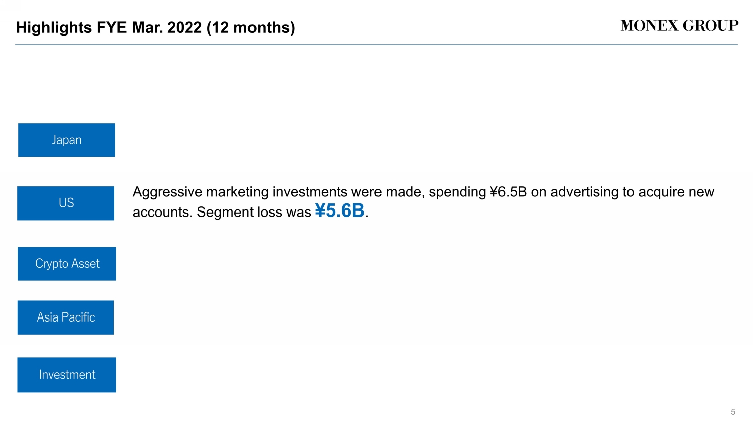 Highlights FYE Mar. 2022 (12 months) 5 Aggressive marketing investments were made, spending \ 6.5B on advertising to acquire new accounts. Segment loss was \ 5.6B . Japan US Crypto Asset Asia Pacific Investment