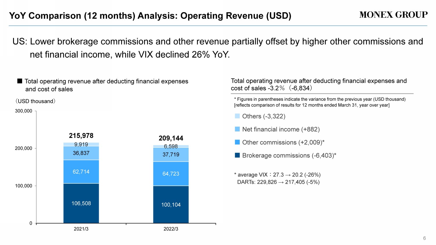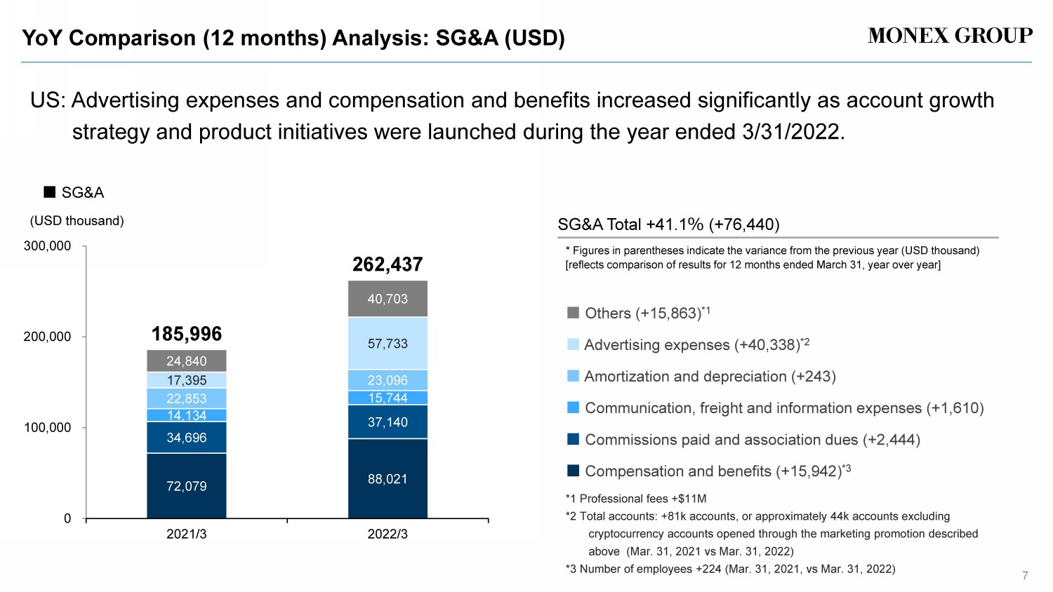YoY Comparison (12 months) Analysis: Operating Revenue (USD) 6 US: Lower brokerage commissions and other revenue partially offset by higher other commissions and net financial income, while VIX declined 26% YoY. * average VIX : 27.3 → 20.2 ( - 26%) DARTs : 229,826 → 217,405 ( - 5 %) ( USD thousand ) ■ Others ( - 3,322) ■ Net financial income (+ 882 ) ■ Other commissions (+2,009)* ■ Brokerage commissions ( - 6,403 )* 106,508 100,104 62,714 64,723 36,837 37,719 9,919 6,598 215,978 209,144 0 100,000 200,000 300,000 2021/3 2022/3 Total operating revenue after deducting financial expenses and cost of sales - 3.2 %( - 6,834 ) * Figures in parentheses indicate the variance from the previous year (USD thousand) [reflects comparison of results for 12 months ended March 31, year over year] ■ Total operating revenue after deducting financial expenses and cost of sales