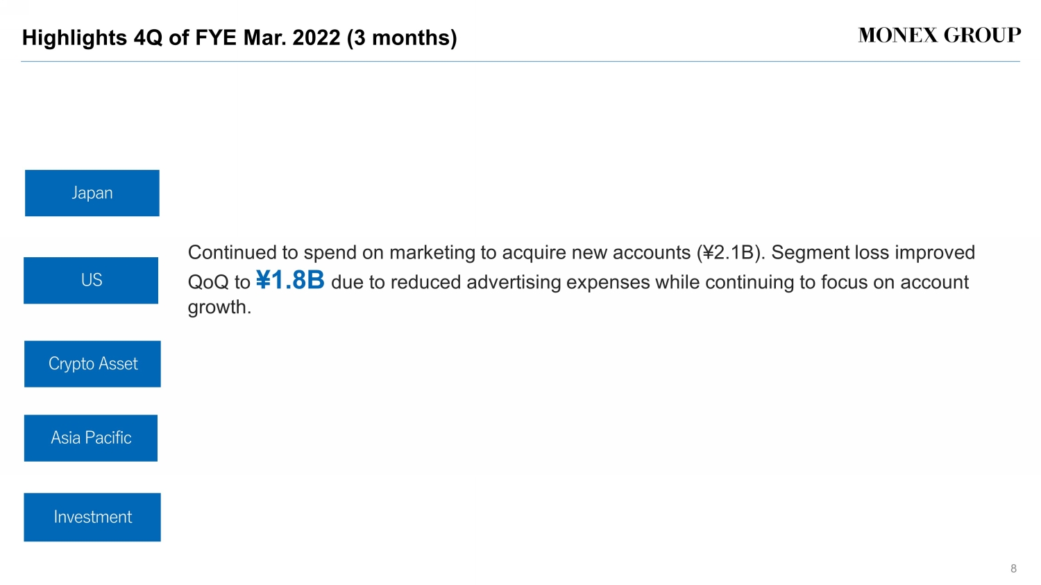 Highlights 4Q of FYE Mar. 2022 (3 months) 8 Continued to spend on marketing to acquire new accounts ( \ 2.1B). Segment loss improved QoQ to \ 1.8B due to reduced advertising expenses while continuing to focus on account growth. Japan US Crypto Asset Asia Pacific Investment