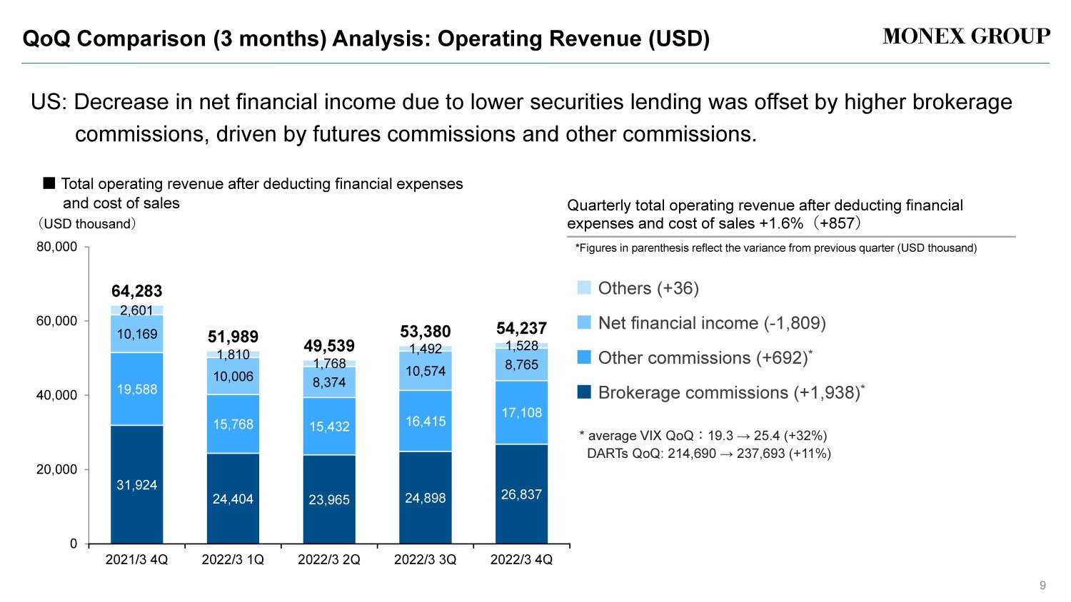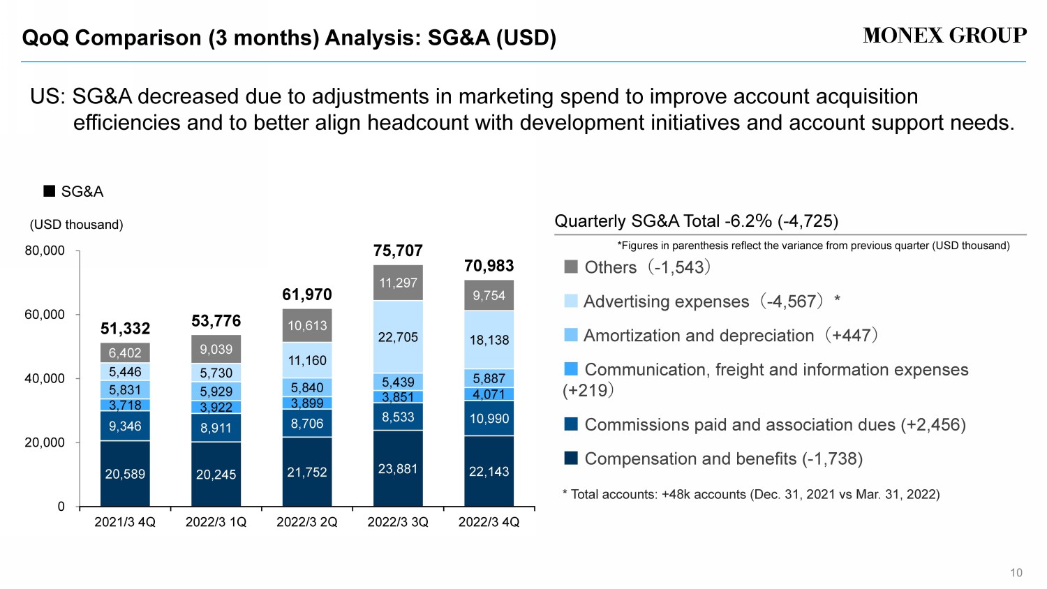 QoQ Comparison (3 months) Analysis: Operating Revenue (USD) 9 US: Decrease in net financial income due to lower securities lending was offset by higher brokerage commissions, driven by futures commissions and other commissions. 31,924 24,404 23,965 24,898 26,837 19,588 15,768 15,432 16,415 17,108 10,169 10,006 8,374 10,574 8,765 2,601 1,810 1,768 1,492 1,528 64,283 51,989 49,539 53,380 54,237 0 20,000 40,000 60,000 80,000 2021/3 4Q 2022/3 1Q 2022/3 2Q 2022/3 3Q 2022/3 4Q ( USD thousand ) Quarterly total operating revenue after deducting financial expenses and cost of sales +1.6% ( +857 ) * Figures in parenthesis reflect the variance from previous quarter (USD thousand) ■ Others (+ 36 ) ■ Net financial income ( - 1,809) ■ Other commissions (+692) * ■ Brokerage commissions (+ 1,938 ) * * average VIX QoQ : 19.3 → 25.4 (+32%) DARTs QoQ : 214,690 → 237,693 ( +11 %) ■ Total operating revenue after deducting financial expenses and cost of sales