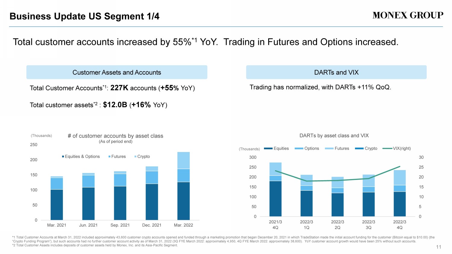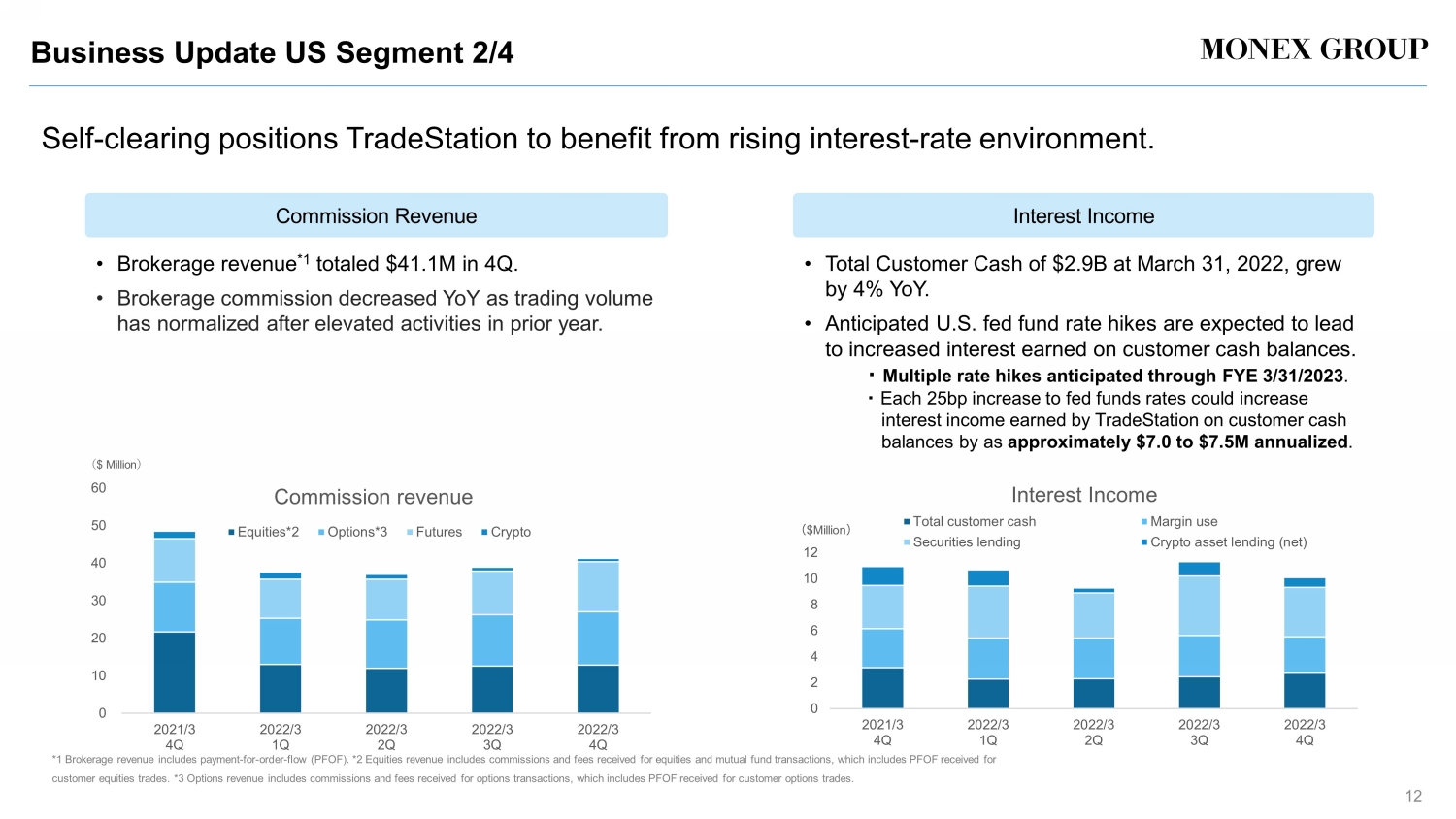 Business Update US Segment 1/4 11 Total customer accounts increased by 55% * 1 YoY. Trading in Futures and Options increased. Total Customer Accounts *1 : 227K accounts ( +55 % YoY) Total customer assets *2 : $12.0B ( +16% YoY) Customer Assets and Accounts DARTs and VIX Trading has normalized, with DARTs + 11% QoQ . 0 50 100 150 200 250 Mar. 2021 Jun. 2021 Sep. 2021 Dec. 2021 Mar. 2022 # of customer accounts by asset class (As of period end) Equities & Options Futures Crypto ( Thousands) *1 Total Customer Accounts at March 31, 2022 included approximately 43,600 customer crypto accounts opened and funded through a marketing promotion that began December 20, 2021 in which TradeStation made the initial account funding for the customer (Bitcoin equal to $10.00) (the “Crypto Funding Program”), but such accounts had no further customer account activity as of March 31, 2022 (3Q FYE March 2022 : a pproximately 4,950, 4Q FYE March 2022: approximately 38,600 ). YoY customer account growth would have been 25% without such accounts. *2 Total Customer Assets includes deposits of customer assets held by Monex, Inc. and its Asia - Pacific Segment. 0 5 10 15 20 25 30 0 50 100 150 200 250 300 2021/3 4Q 2022/3 1Q 2022/3 2Q 2022/3 3Q 2022/3 4Q DARTs by asset class and VIX Equities Options Futures Crypto VIX(right) ( Thousands)