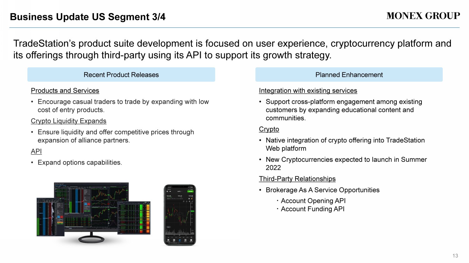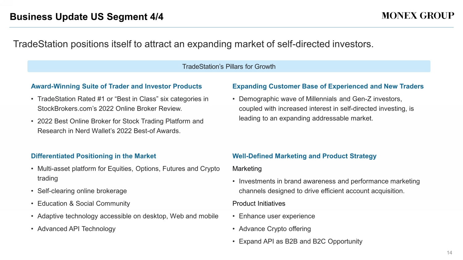 Business Update US Segment 3/4 13 TradeStation’s product suite development is focused on user experience, cryptocurrency platform and its offerings through third - party using its API to support its growth strategy. Products and Services • Encourage casual traders to trade by expanding with low cost of entry products . Crypto Liquidity Expands • Ensure liquidity and offer competitive prices through expansion of alliance partners. API • Expand options capabilities. Recent Product Releases Planned Enhancement Integration with existing services • Support cross - platform engagement among existing customers by expanding educational content and communities. Crypto • Native integration of crypto offering into TradeStation Web platform • New Cryptocurrencies expected to launch in Summer 2022 Third - Party Relationships • Brokerage As A Service Opportunities ・ Account Opening API ・ Account Funding API