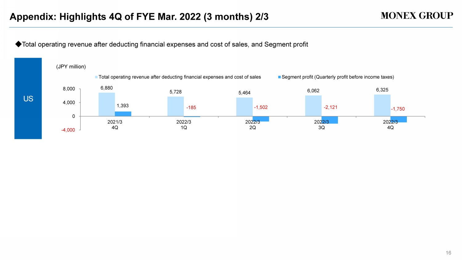Appendix: Highlights FYE Mar. 2022 (12 months) 2/3 (JPY million) US ◆ Total operating revenue after deducting financial expenses and cost of sales, and Segment profit 15 17,417 19,338 19,887 22,958 23,579 281 1,978 1,763 3,200 - 5,557 -15,000 -5,000 5,000 15,000 25,000 2018/3 2019/3 2020/3 2021/3 2022/3 Total operating revenue after deducting financial expences and cost of sales Segment profit