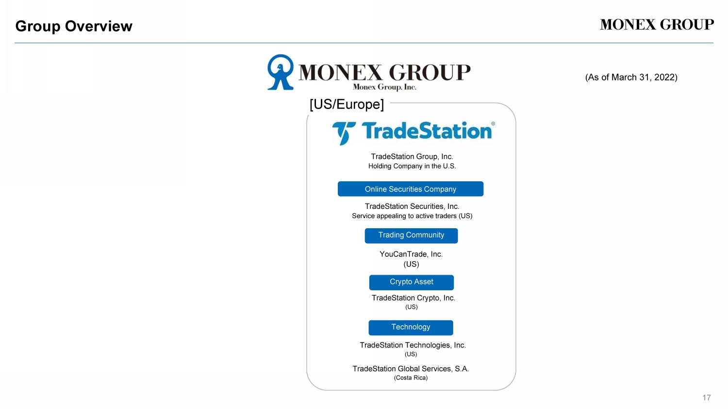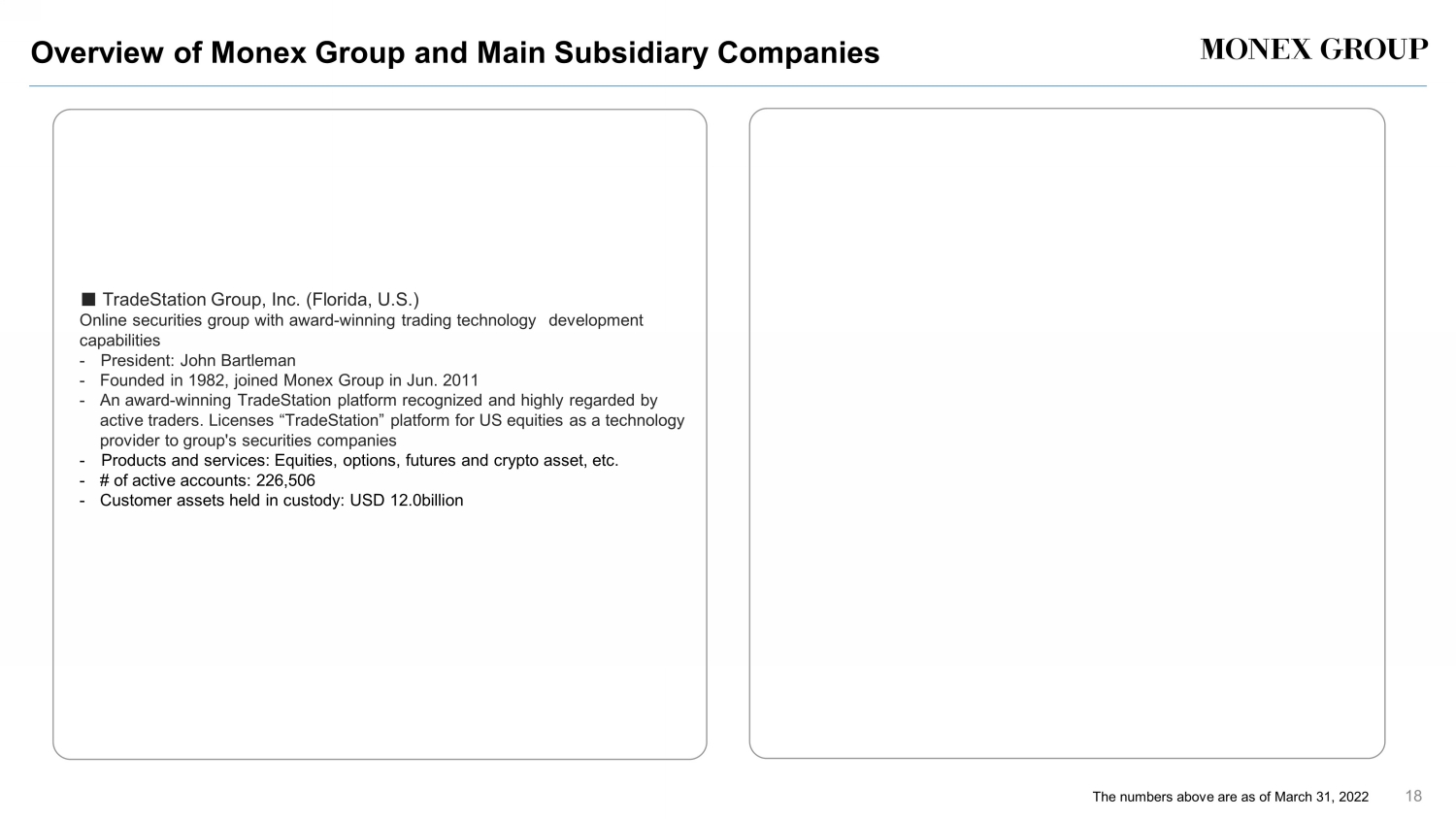 Group Overview 17 (As of March 31 , 2022) Online Securities Company TradeStation Securities, Inc. Service appealing to active traders (US) TradeStation Group, Inc. Holding Company in the U.S. TradeStation Technologies, Inc. (US) YouCanTrade, Inc. (US) Technology Trading Community TradeStation Global Services, S.A. (Costa Rica) [US/Europe] TradeStation Crypto, Inc. (US) Crypto Asset