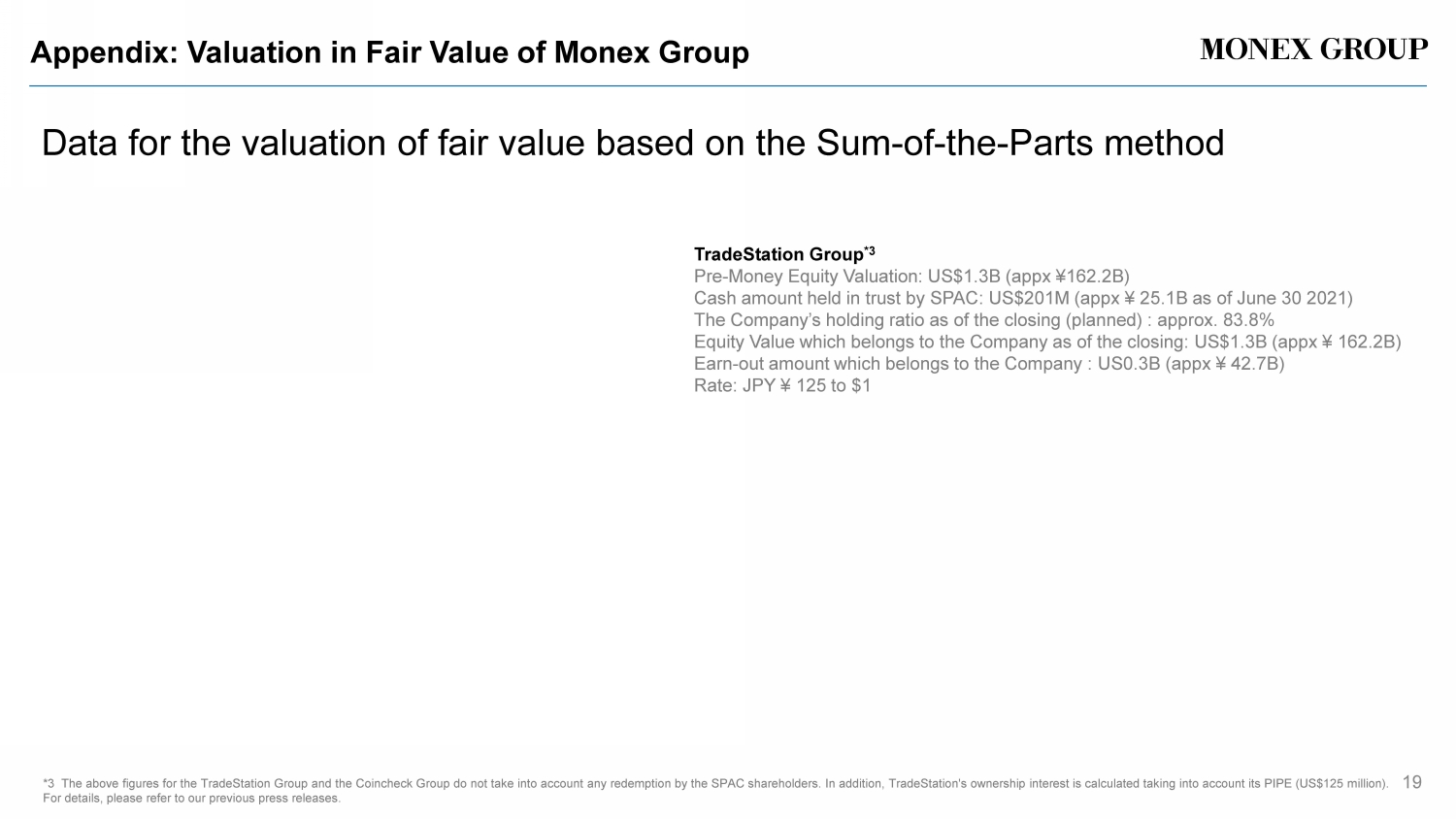 Appendix: Valuation in Fair Value of Monex Group Data for the valuation of fair value based on the Sum - of - the - Parts method 19 *3 The above figures for the TradeStation Group and the Coincheck Group do not take into account any redemption by the SPAC shareholders. In addition, TradeStation's ownership interest is calculated taking into account its PIPE (US$125 million). For details, please refer to our previous press releases . TradeStation Group *3 Pre - Money Equity Valuation: US$1.3B (appx \ 162.2B) Cash amount held in trust by SPAC : US$201M (appx \ 25.1B as of June 30 2021) The Company’s holding ratio as of the closing (planned) : approx. 83.8% Equity Value which belongs to the Company as of the closing: US$1.3B (appx \ 162.2B) Earn - out amount which belongs to the Company : US0.3B (appx \ 42.7B) Rate: JPY \ 125/$