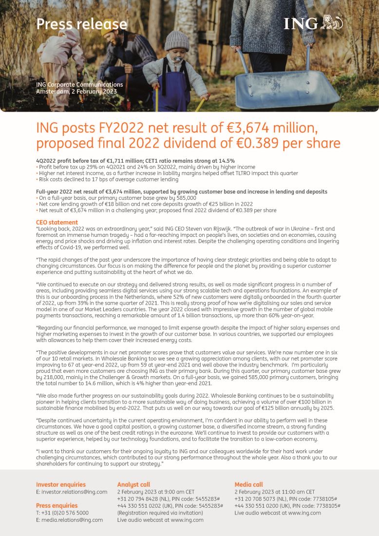 Investor enquiries E: investor.relations@ing.com Press enquiries T: +31 (0)20 576 5000 E: media.relations@ing.com Analyst call 2 February 2023 at 9:00 am CET +31 20 794 8428 (NL), PIN code: 5455283# +44 330 551 0202 (UK), PIN code: 5455283# (Registration required via invitation) Live audio webcast at www.ing.com Media call 2 February 2023 at 11:00 am CET +31 20 708 5073 (NL), PIN code: 7738105# +44 330 551 0200 (UK), PIN code: 7738105# Live audio webcast at www.ing.com ING posts FY2022 net result of €3,674 million, proposed fi nal 2022 dividend of €0.389 per share 4Q2022 pro fi t before tax of €1,711 million; CET1 ratio remains strong at 14.5% • Pro fi t before tax up 29% on 4Q2021 and 24% on 3Q2022, mainly driven by higher income • Higher net interest income, as a further increase in liability margins helped o ff set TLTRO impact this quarter • Risk costs declined to 17 bps of average customer lending Full - year 2022 net result of €3,674 million, supported by growing customer base and increase in lending and deposits • On a full - year basis, our primary customer base grew by 585,000 • Net core lending growth of €18 billion and net core deposits growth of €25 billion in 2022 • Net result of €3,674 million in a challenging year; proposed fi nal 2022 dividend of €0.389 per share CEO statement “Looking back, 2022 was an extraordinary year,” said ING CEO Steven van Rijswijk. “The outbreak of war in Ukraine – fi rst and foremost an immense human tragedy – had a far - reaching impact on people’s lives, on societies and on economies, causing energy and price shocks and driving up in fl ation and interest rates. Despite the challenging operating conditions and lingering e ff ects of Covid - 19, we performed well. “The rapid changes of the past year underscore the importance of having clear strategic priorities and being able to adapt to changing circumstances. Our focus is on making the di ff erence for people and the planet by providing a superior customer experience and putting sustainability at the heart of what we do. “We continued to execute on our strategy and delivered strong results, as well as made signi fi cant progress in a number of areas, including providing seamless digital services using our strong scalable tech and operations foundations. An example of this is our onboarding process in the Netherlands, where 52% of new customers were digitally onboarded in the fourth quarter of 2022, up from 39% in the same quarter of 2021. This is really strong proof of how we’re digitalising our sales and service model in one of our Market Leaders countries. The year 2022 closed with impressive growth in the number of global mobile payments transactions, reaching a remarkable amount of 1.4 billion transactions, up more than 60% year - on - year. “Regarding our fi nancial performance, we managed to limit expense growth despite the impact of higher salary expenses and higher marketing expenses to invest in the growth of our customer base. In various countries, we supported our employees with allowances to help them cover their increased energy costs. “The positive developments in our net promoter scores prove that customers value our services. We’re now number one in six of our 10 retail markets. In Wholesale Banking too we see a growing appreciation among clients, with our net promoter score improving to 67 at year - end 2022, up from 59 at year - end 2021 and well above the industry benchmark. I’m particularly proud that even more customers are choosing ING as their primary bank. During this quarter, our primary customer base grew by 218,000, mainly in the Challenger & Growth markets. On a full - year basis, we gained 585,000 primary customers, bringing the total number to 14.6 million, which is 4% higher than year - end 2021. “We also made further progress on our sustainability goals during 2022. Wholesale Banking continues to be a sustainability pioneer in helping clients transition to a more sustainable way of doing business, achieving a volume of over €100 billion in sustainable fi nance mobilised by end - 2022. That puts us well on our way towards our goal of €125 billion annually by 2025. “Despite continued uncertainty in the current operating environment, I’m con fi dent in our ability to perform well in these circumstances. We have a good capital position, a growing customer base, a diversi fi ed income stream, a strong funding structure as well as one of the best credit ratings in the eurozone. We’ll continue to invest to provide our customers with a superior experience, helped by our technology foundations, and to facilitate the transition to a low - carbon economy. “I want to thank our customers for their ongoing loyalty to ING and our colleagues worldwide for their hard work under challenging circumstances, which contributed to our strong performance throughout the whole year. Also a thank you to our shareholders for continuing to support our strategy.” Press release ING Corporate Communications Amsterdam, 2 February 2023