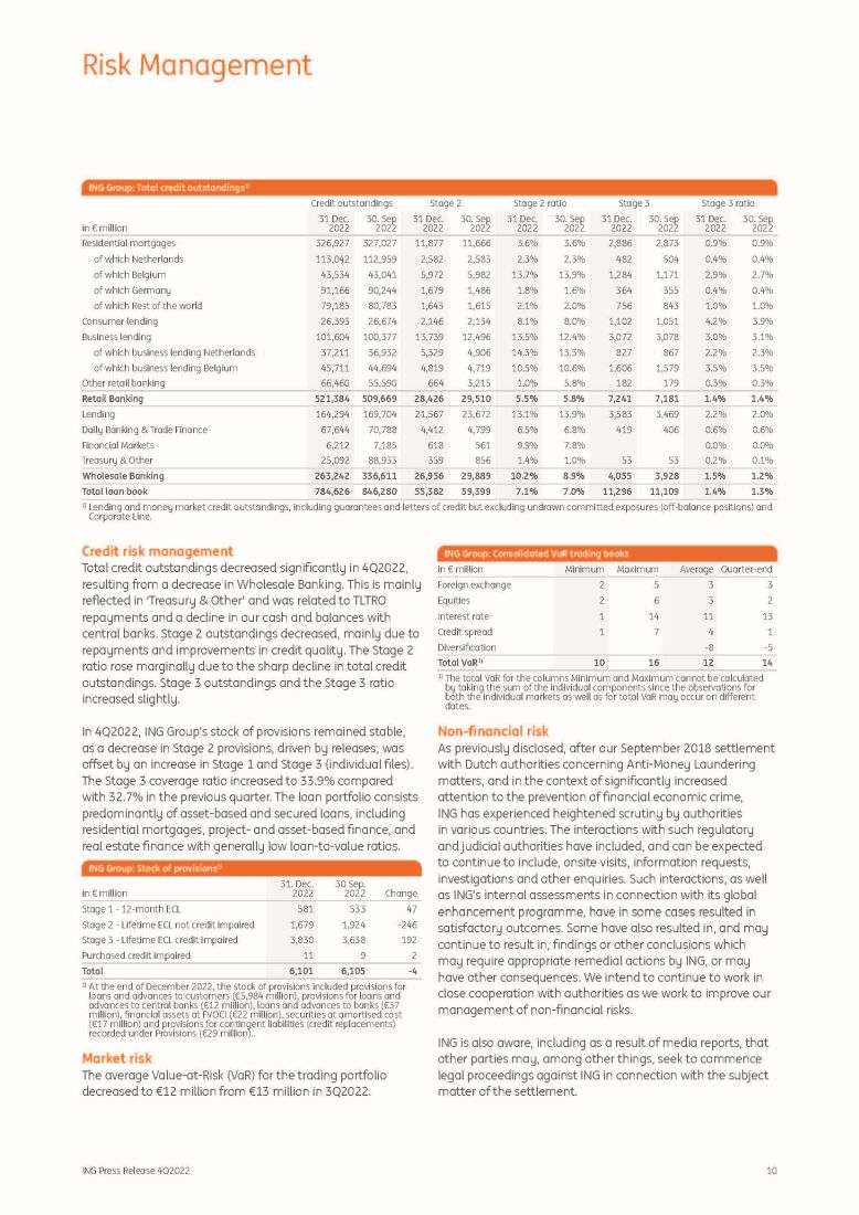 Risk Management in € million 31 Dec. 2022 30. Sep 2022 31 Dec. 2022 30. Sep 2022 31 Dec. 2022 30. Sep 2022 31 Dec. 2022 30. Sep 2022 31 Dec. 2022 30. Sep 2022 Residential mortgages of which Netherlands of which Belgium of which Germany of which Rest of the world Consumer lending Business lending of which business lending Netherlands of which business lending Belgium Other retail banking 326,927 113,042 43,534 91,166 79,185 26,393 101,604 37,211 45,711 66,460 327,027 112,959 43,041 90,244 80,783 26,674 100,377 36,932 44,694 55,590 11,877 2,582 5,972 1,679 1,643 2,146 13,739 5,329 4,819 664 11,666 2,583 5,982 1,486 1,615 2,134 12,496 4,906 4,719 3,215 3.6% 2.3% 13.7% 1.8% 2.1% 8.1% 13.5% 14.3% 10.5% 1.0% 3.6% 2.3% 13.9% 1.6% 2.0% 8.0% 12.4% 13.3% 10.6% 5.8% 2,886 482 1,284 364 756 1,102 3,072 827 1,606 182 2,873 504 1,171 355 843 1,051 3,078 867 1,579 179 0.9% 0.4% 2.9% 0.4% 1.0% 4.2% 3.0% 2.2% 3.5% 0.3% 0.9% 0.4% 2.7% 0.4% 1.0% 3.9% 3.1% 2.3% 3.5% 0.3% Retail Banking 521,384 509,669 28,426 29,510 5.5% 5.8% 7,241 7,181 1.4% 1.4% Lending Daily Banking & Trade Finance Financial Markets Treasury & Other 164,294 67,644 6,212 25,092 169,704 70,788 7,185 88,933 21,567 4,412 618 359 23,672 4,799 561 856 13.1% 6.5% 9.9% 1.4% 13.9% 6.8% 7.8% 1.0% 3,583 419 53 3,469 406 53 2.2% 0.6% 0.0% 0.2% 2.0% 0.6% 0.0% 0.1% Wholesale Banking 263,242 336,611 26,956 29,889 10.2% 8.9% 4,055 3,928 1.5% 1.2% Total loan book 784,626 846,280 55,382 59,399 7.1% 7.0% 11,296 11,109 1.4% 1.3% ING Group: Total credit outstandings 1) Credit outstandings Stage 2 Stage 2 ratio Stage 3 Stage 3 ratio 1) Lending and money market credit outstandings, including guarantees and letters of credit but excluding undrawn committed exposures (o ff - balance positions) and Corporate Line. Credit risk management Total credit outstandings decreased signi fi cantly in 4Q2022, resulting from a decrease in Wholesale Banking. This is mainly re fl ected in ‘Treasury & Other' and was related to TLTRO repayments and a decline in our cash and balances with central banks. Stage 2 outstandings decreased, mainly due to repayments and improvements in credit quality. The Stage 2 ratio rose marginally due to the sharp decline in total credit outstandings. Stage 3 outstandings and the Stage 3 ratio increased slightly. In 4Q2022, ING Group’s stock of provisions remained stable, as a decrease in Stage 2 provisions, driven by releases, was o ff set by an increase in Stage 1 and Stage 3 (individual fi les). The Stage 3 coverage ratio increased to 33.9% compared with 32.7% in the previous quarter. The loan portfolio consists predominantly of asset - based and secured loans, including residential mortgages, project - and asset - based fi nance, and real estate fi nance with generally low loan - to - value ratios. ING Group: Stock of provisions 1) in € million 31. Dec. 2022 30 Sep. 2022 Change Stage 1 - 12 - month ECL 581 533 47 Stage 2 - Lifetime ECL not credit impaired 1,679 1,924 - 246 Stage 3 - Lifetime ECL credit impaired 3,830 3,638 192 Purchased credit impaired 11 9 2 Total 6,101 6,105 - 4 1) At the end of December 2022, the stock of provisions included provisions for loans and advances to customers (€5,984 million), provisions for loans and advances to central banks (€12 million), loans and advances to banks (€37 million), fi nancial assets at FVOCI (€22 million), securities at amortised cost (€17 million) and provisions for contingent liabilities (credit replacements) recorded under Provisions (€29 million).. Market risk The average Value - at - Risk (VaR) for the trading portfolio decreased to €12 million from €13 million in 3Q2022. ING Group: Consolidated VaR trading books ING Press Release 4Q2022 10 in € million Minimum Maximum Average Quarter - end Foreign exchange 2 5 3 3 Equities 2 6 3 2 Interest rate 1 14 11 13 Credit spread 1 7 4 1 Diversi fi cation - 8 - 5 Total VaR 1) 10 16 12 14 1) The total VaR for the columns Minimum and Maximum cannot be calculated by taking the sum of the individual components since the observations for both the individual markets as well as for total VaR may occur on di ff erent dates. Non - fi nancial risk As previously disclosed, after our September 2018 settlement with Dutch authorities concerning Anti - Money Laundering matters, and in the context of signi fi cantly increased attention to the prevention of fi nancial economic crime, ING has experienced heightened scrutiny by authorities in various countries. The interactions with such regulatory and judicial authorities have included, and can be expected to continue to include, onsite visits, information requests, investigations and other enquiries. Such interactions, as well as ING’s internal assessments in connection with its global enhancement programme, have in some cases resulted in satisfactory outcomes. Some have also resulted in, and may continue to result in, fi ndings or other conclusions which may require appropriate remedial actions by ING, or may have other consequences. We intend to continue to work in close cooperation with authorities as we work to improve our management of non - fi nancial risks. ING is also aware, including as a result of media reports, that other parties may, among other things, seek to commence legal proceedings against ING in connection with the subject matter of the settlement.